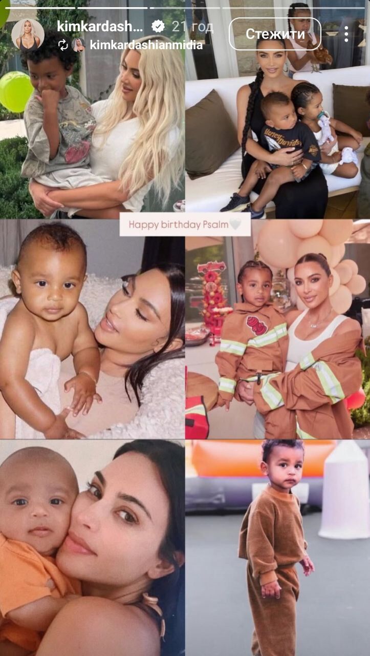 Американська модель і бізнесвумен Кім Кардаш'ян 10 травня в Instagram Stories привітала свого сина Псалма із днем народження.