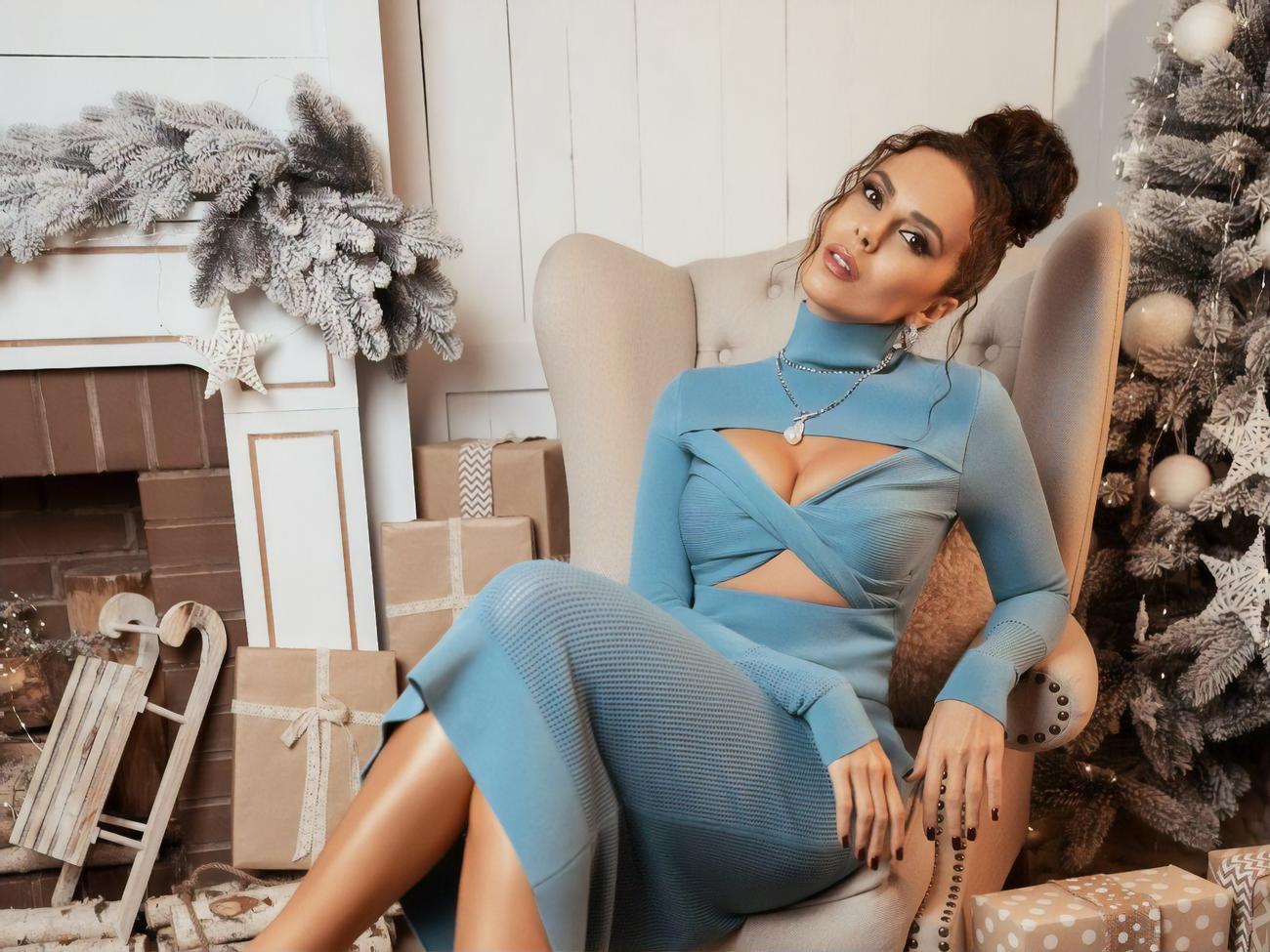 На знімку її зафіксовано в блискучій золотистій сукні з декольте і високим розрізом. Потап – у чорному костюмі. Вони позували біля прикрашеної ялинки.