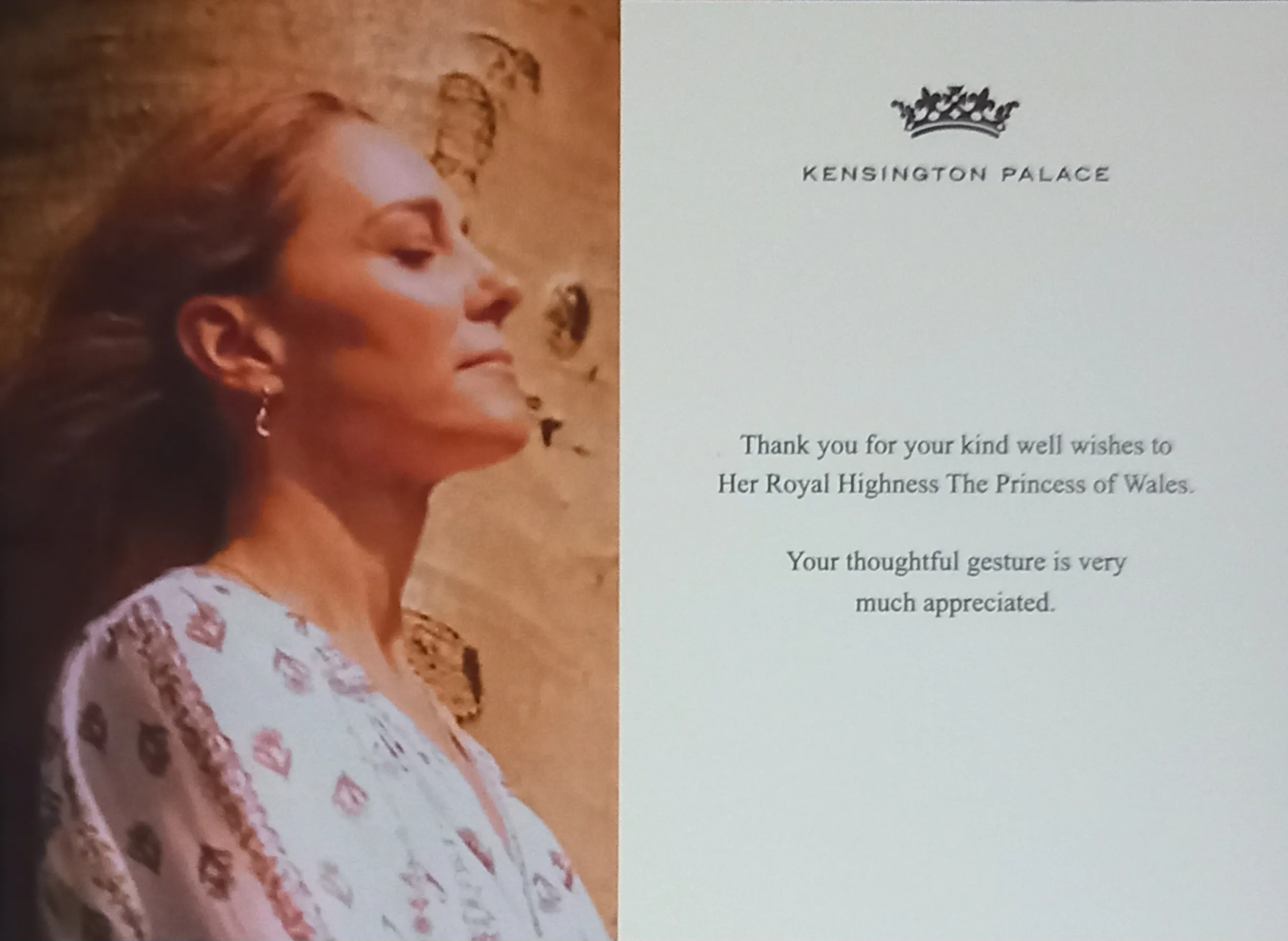 "Дякую за ваші добрі побажання її королівській високості принцесі Уельській. Ваш жест уваги дуже цінується", – ідеться у тексті на листівці із зображенням принцеси Уельської.
