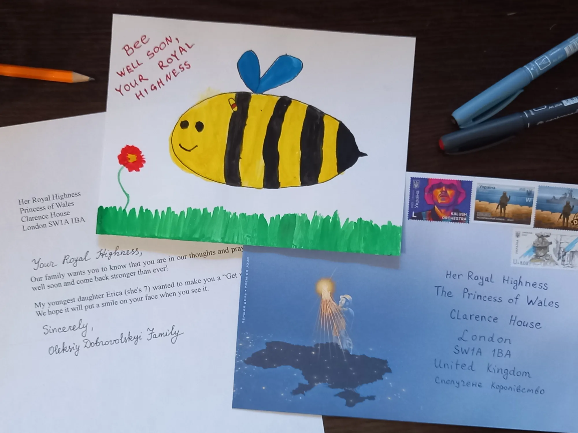 Він також показав листа, який із дочкою надіслав дружині принца Вільяма. На листівці із зображенням бджоли, яка літає над полем, Добровольські розмістили побажання принцесі Уельській якнайшвидше одужувати.