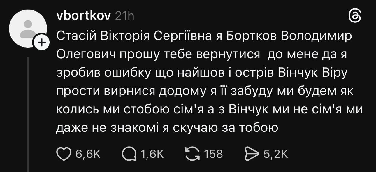 Сам пост було написано як зі стилістичними, так і з орфографічними помилками, але з нього зрозуміло, що Бортков кається, що "припустився помилки", зустрівши іншу жінку – Вінчук Віру. Покаявшись, він почав благати Стасій повернутися додому.