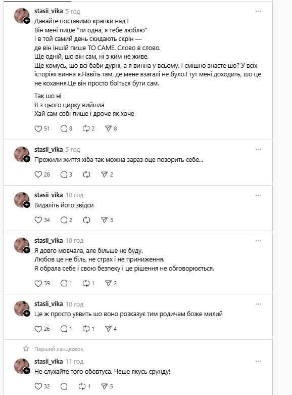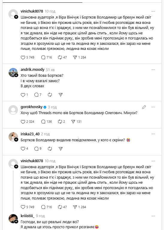 Ким насправді є герої цієї історії і чому вони вирішили публічно з'ясувати свої стосунки, поки невідомо – Стасій і Бортко мають типові анонімні сторінки, і лише у Вінічук у профілі є фото, а старі пости датовані лютим 2025 року.