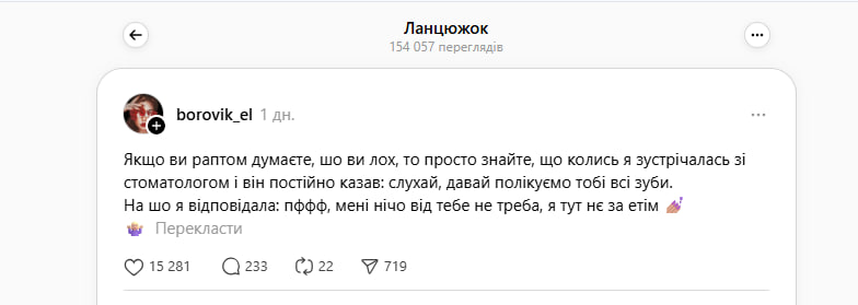 Жартівливий пост української блогерки Олени Боровик про її давній роман зі стоматологом викликав небувалий резонанс у мережі Threads – він за добу зібрав понад 150 тис. переглядів і більше ніж 15 тис. лайків.