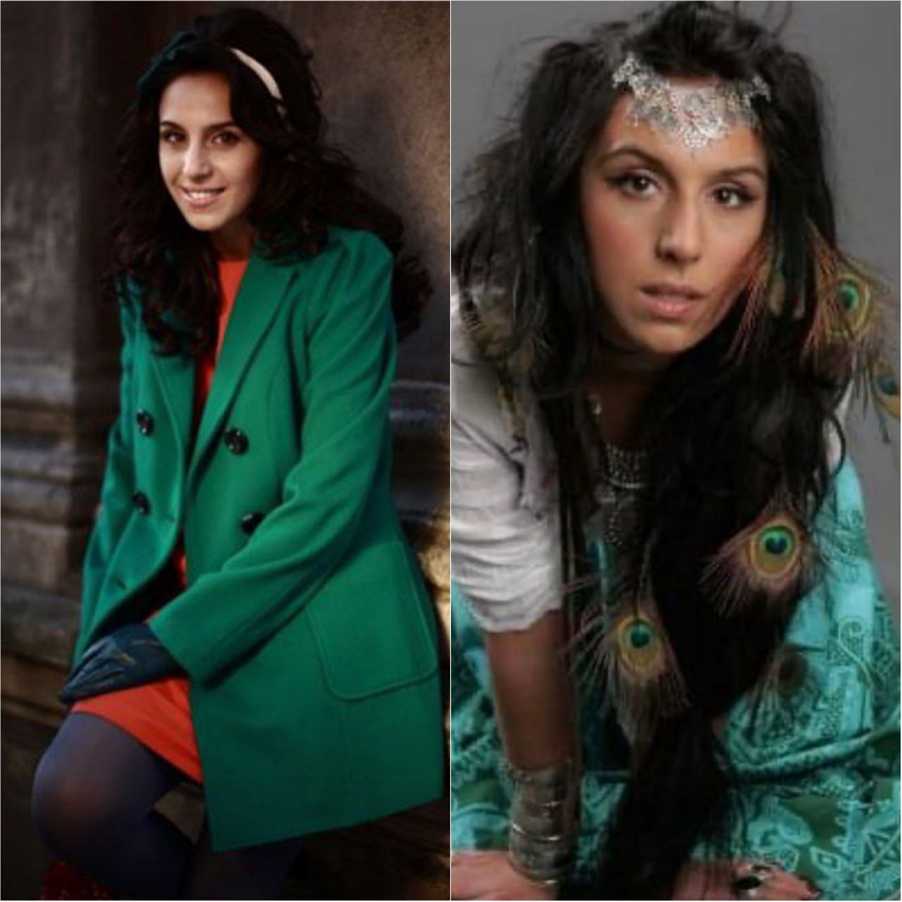 На першій світлині Джамала позує в зеленому пальті, червоній сукні й рукавичках, на другій – із зачіскою з пір'ям павича.