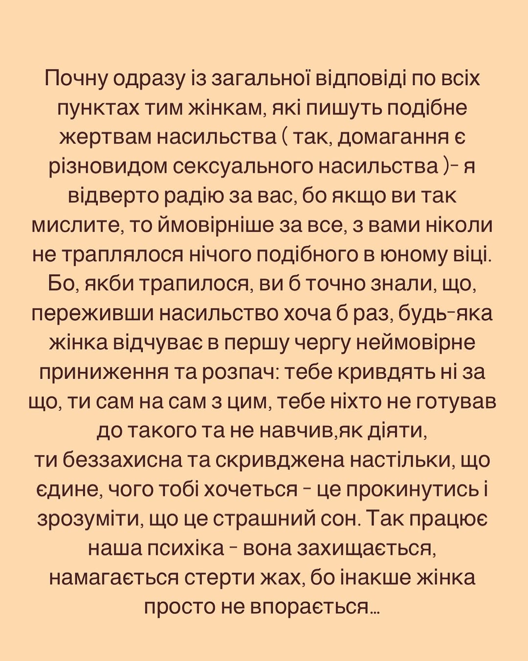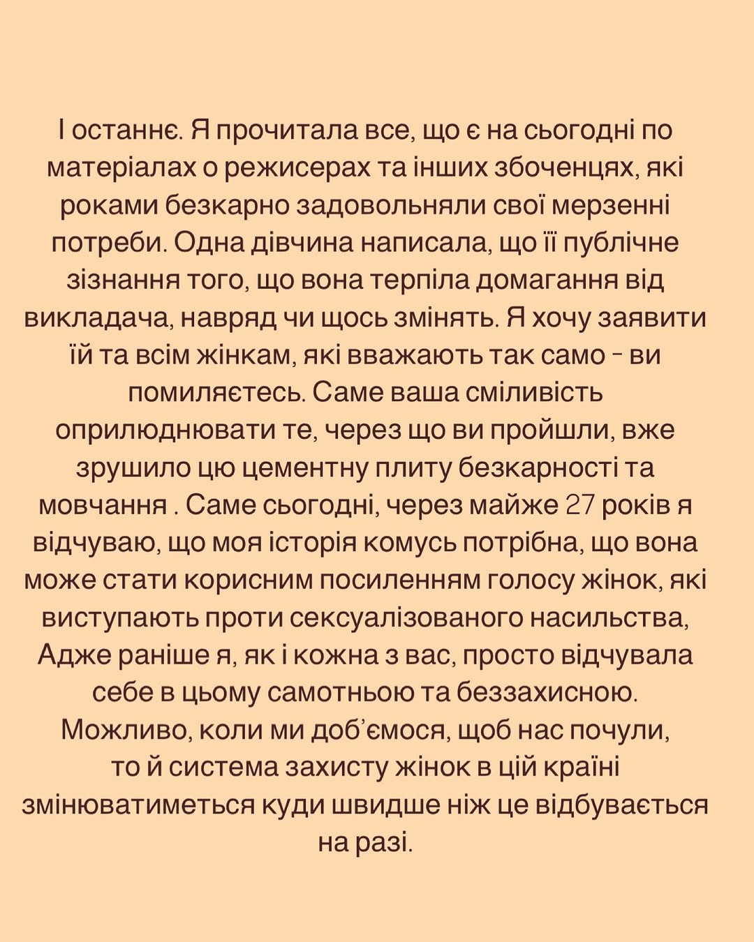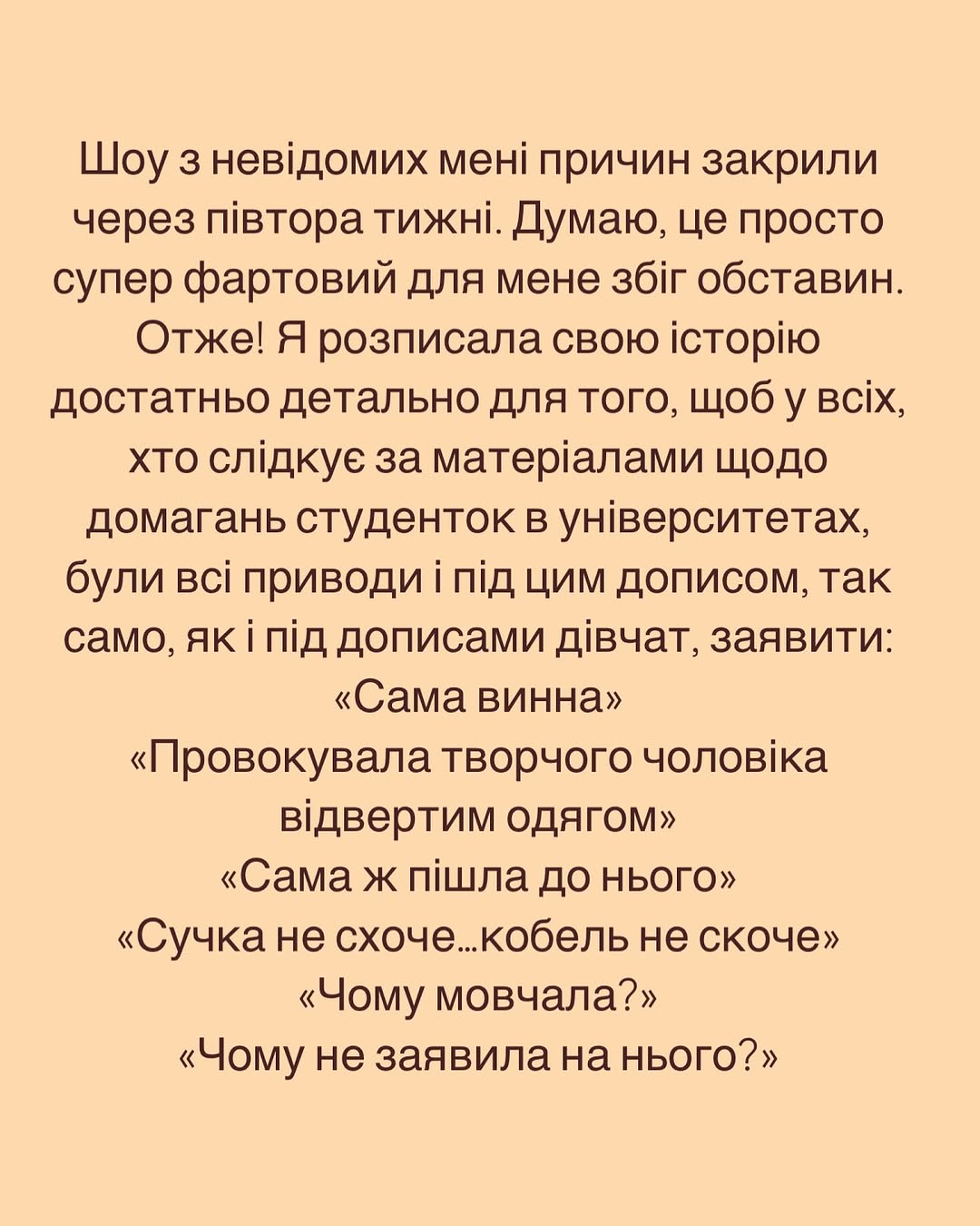"Мене домагався режисер мого першого телевізійного шоу. Чи знала я тоді, що настане день і я ось так напишу про це? Ні в якому разі. Про це взагалі не було думок. Єдине, чого я тоді прагнула, – щоб не дізнався ніхто з величезної знімальної групи. А ще я дуже боялася, що щось запідозрить моя єдина подруга, якій одній було на мене не байдуже там. Але з якихось дивних причин вона була закохана в того "генія", – написала ведуча.