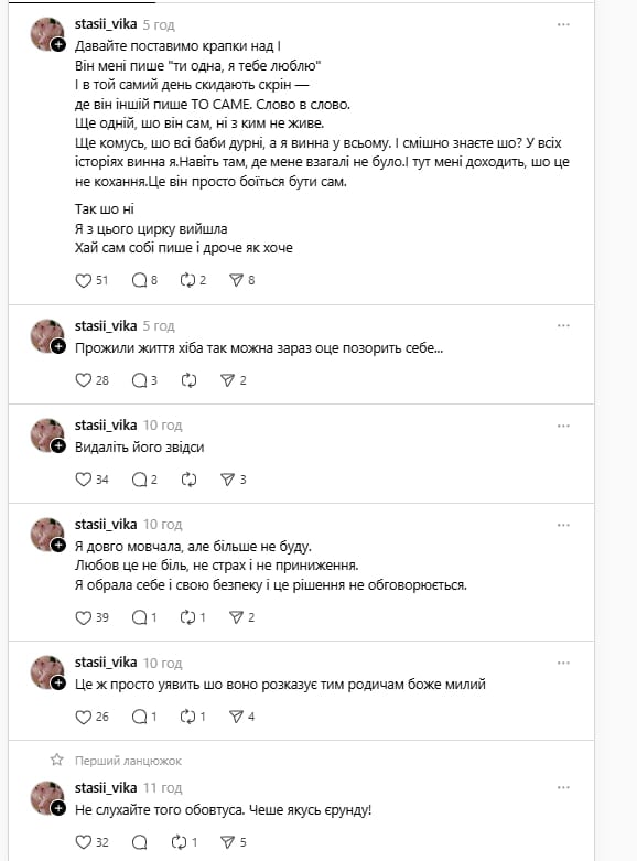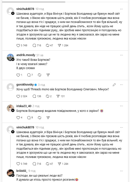 Ким насправді є герої цієї історії і чому вони вирішили публічно з'ясувати свої стосунки, поки невідомо – Стасій і Бортко мають типові анонімні сторінки, і лише у Вінічук у профілі є фото, а старі пости датовані лютим 2025 року.