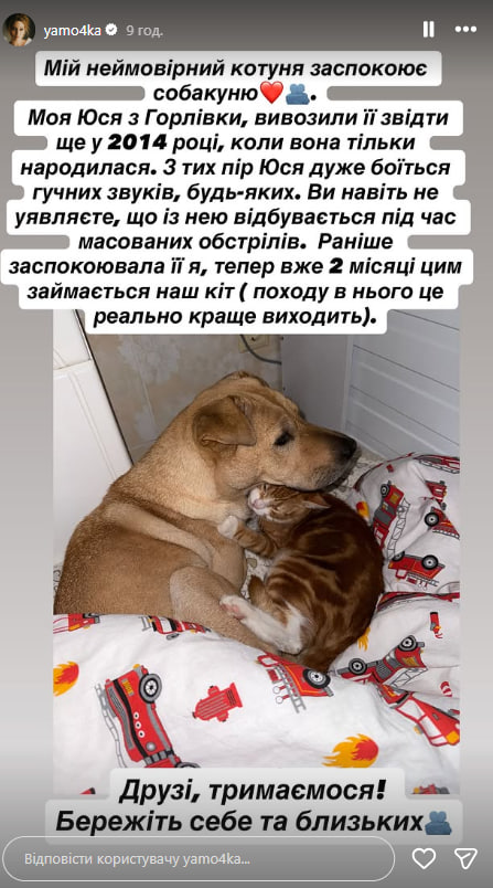 "Мій неймовірний котуня заспокоює собакуню, – прокоментувала вона знімок. – Моя Юся з Горлівки, вивозили її звідти ще у 2014 році, коли вона тільки народилася. Із тих пір Юся дуже боїться гучних звуків, будь-яких. Ви навіть не уявляєте, що з нею відбувається під час масованих обстрілів".