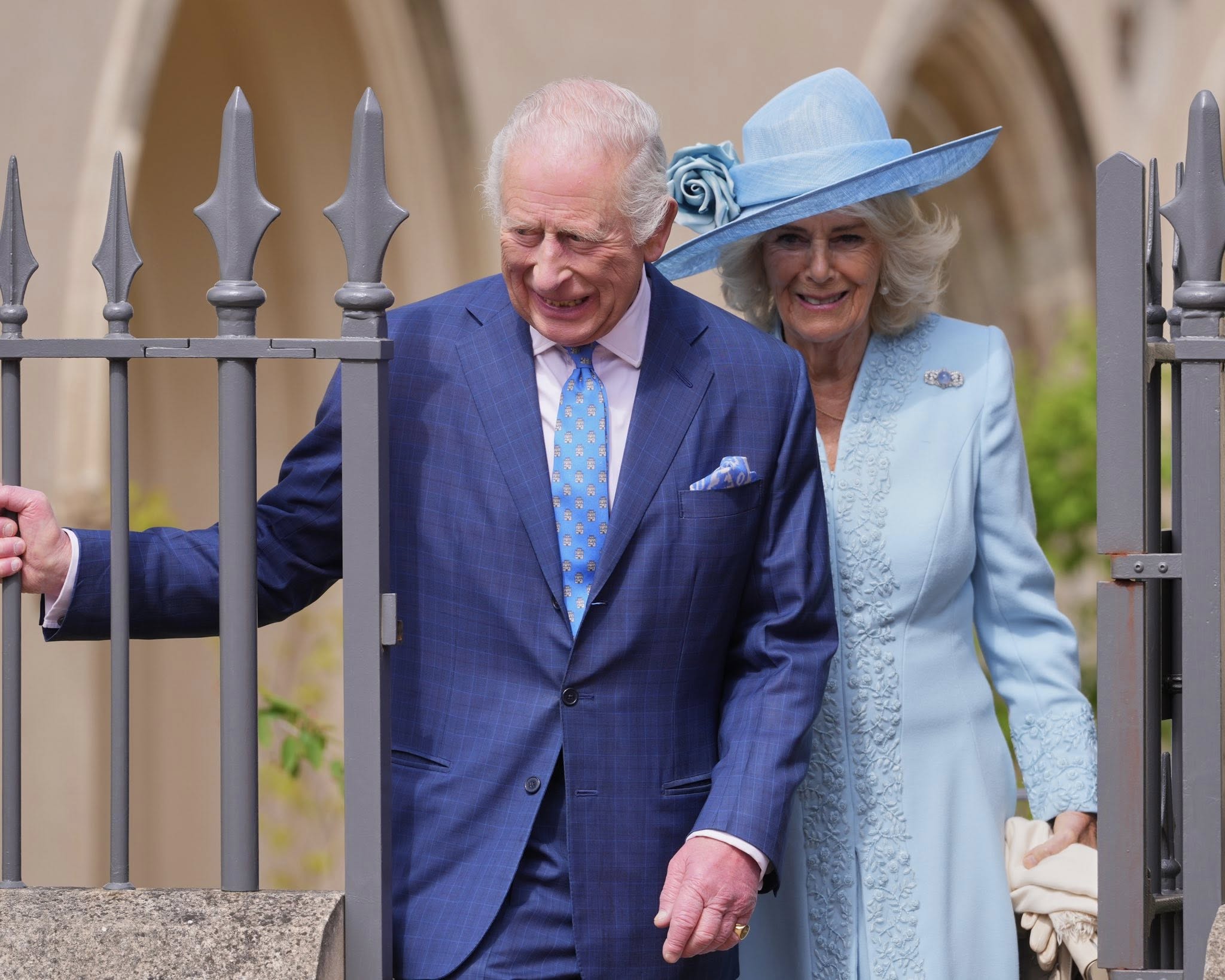 Чарльз ІІІ з'явився на заході у синьому костюмі. Його дружина Камілла вибрала для виходу блакитні сукню й капелюх.