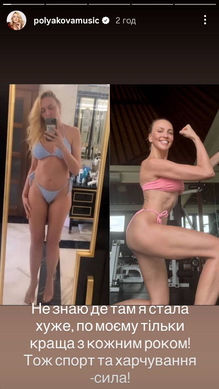"Не знаю, де там я стала гіршою, здається, тільки краща з кожним роком! Тож спорт і харчування – сила!" – підписала Полякова колаж з двох фото, на яких показала свої зміни.