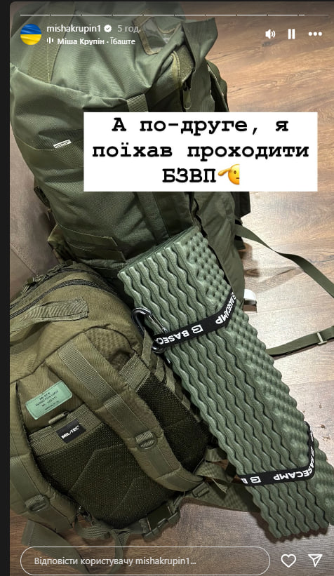 Крупін в Instagram Stories додав, що вирушив на базову військову підготовку.