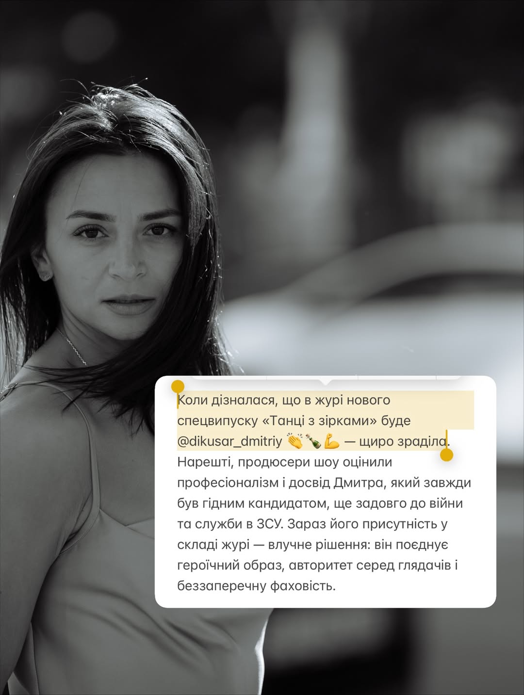"Нарешті продюсери шоу оцінили професіоналізм і досвід Дмитра, який завжди був гідним кандидатом ще задовго до війни, до служби у ЗСУ", – написала вона. – Зараз його присутність у складі журі – влучне рішення: він поєднує героїчний образ, авторитет серед глядачів і беззаперечну фаховість".