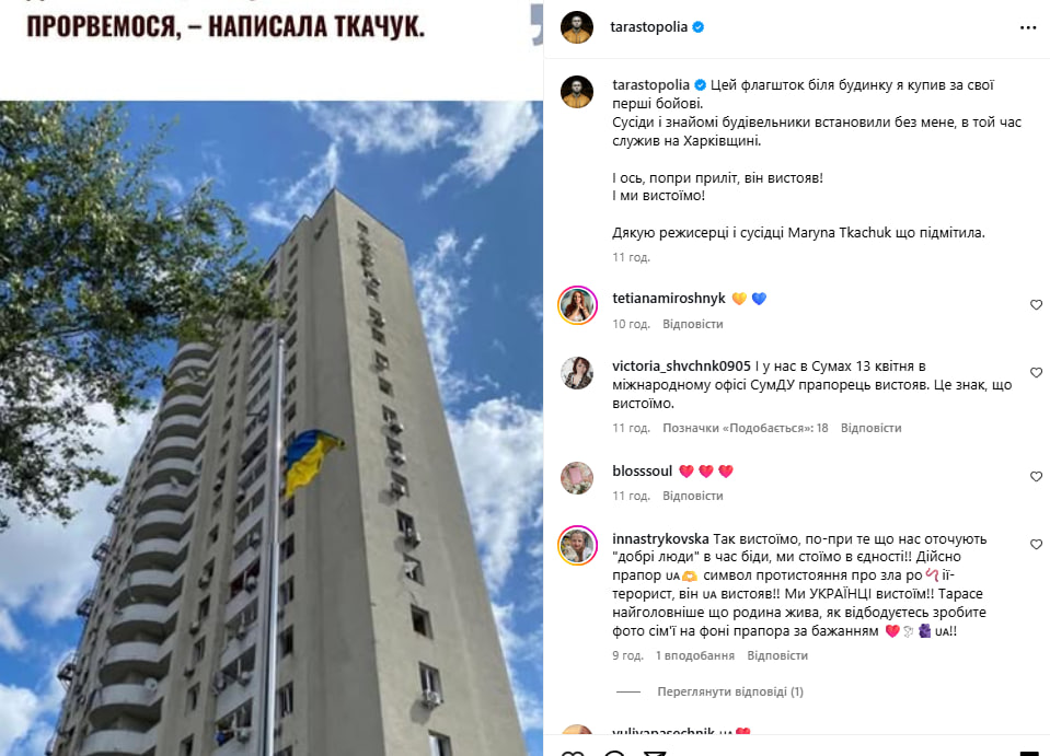 Фронтмен українського гурту "Антитіла" Тарас Тополя 25 червня в Instagram опублікував фото, на якому зображено вцілілий після ракетного удару по житловому будинку в Києві флагшток.