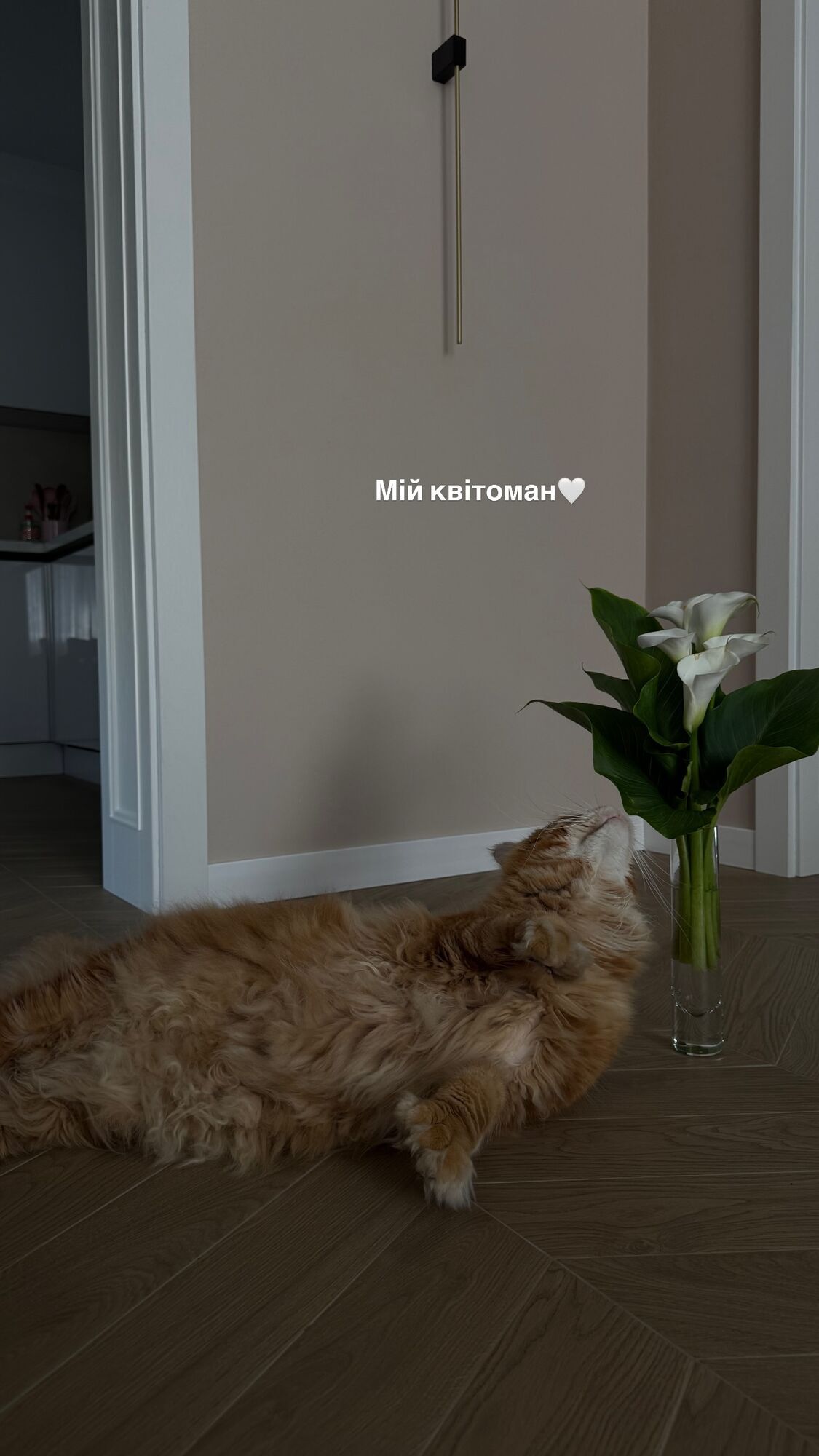 На знімку спортсменка показала свого улюбленця – рудого кота породи мейн-кун Віскі. Кота знято біля вази з калами, яка стоїть на підлозі.
