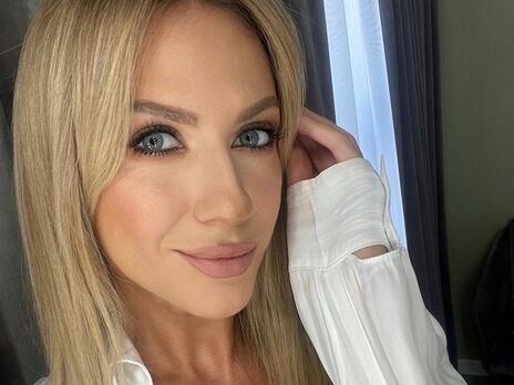 Нікітюк на фото одягнена в коротку блакитну сукню, а також із білосніжними кучерями на голові.