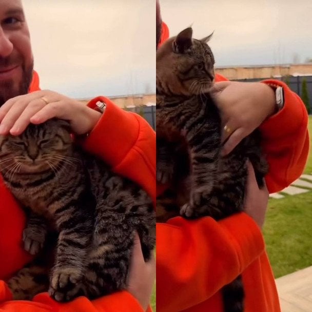 Танчинець постав у помаранчевому світшоті, гладячи кота. На його підмізинному пальці видно широку гладку обручку із жовтого металу.