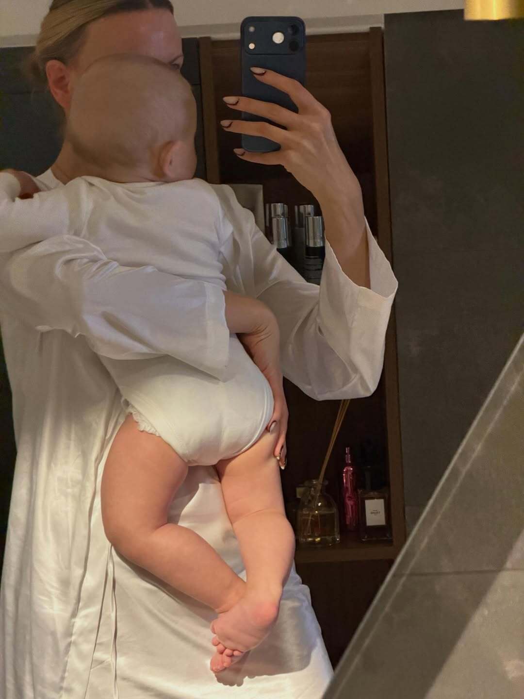 1. Удома. Нікітюк на першому фото, яке вона зробила вдома перед дзеркалом, показалася із сином на руках. І мама, і дитина – у білому одязі.