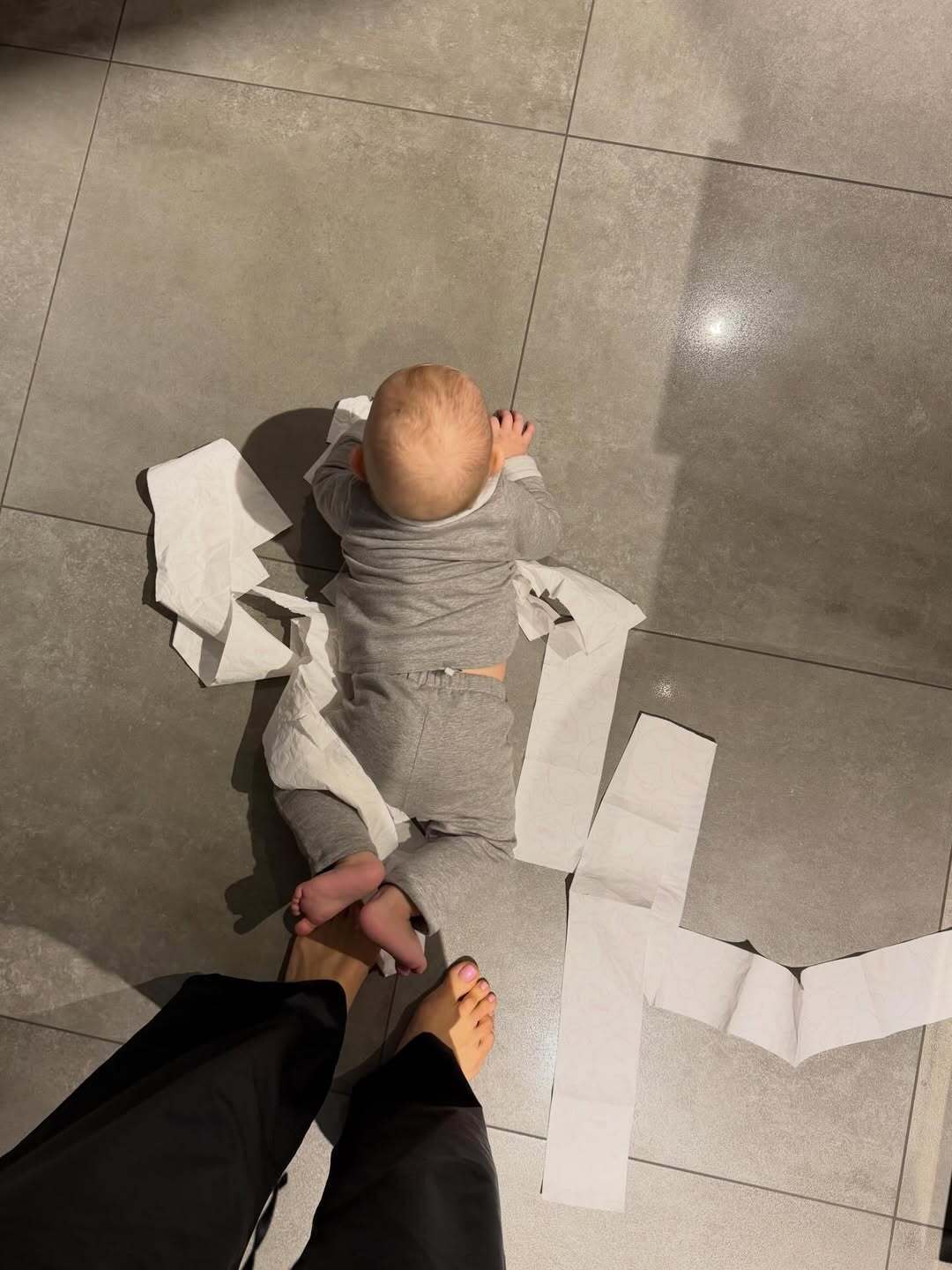 3. На підлозі. На третьому знімку малюка зафіксовано в кімнаті під час того, як він повзає по підлозі. Поруч лежить біла стрічка, схожа на туалетний папір. Імовірно, він грався із цим предметом.