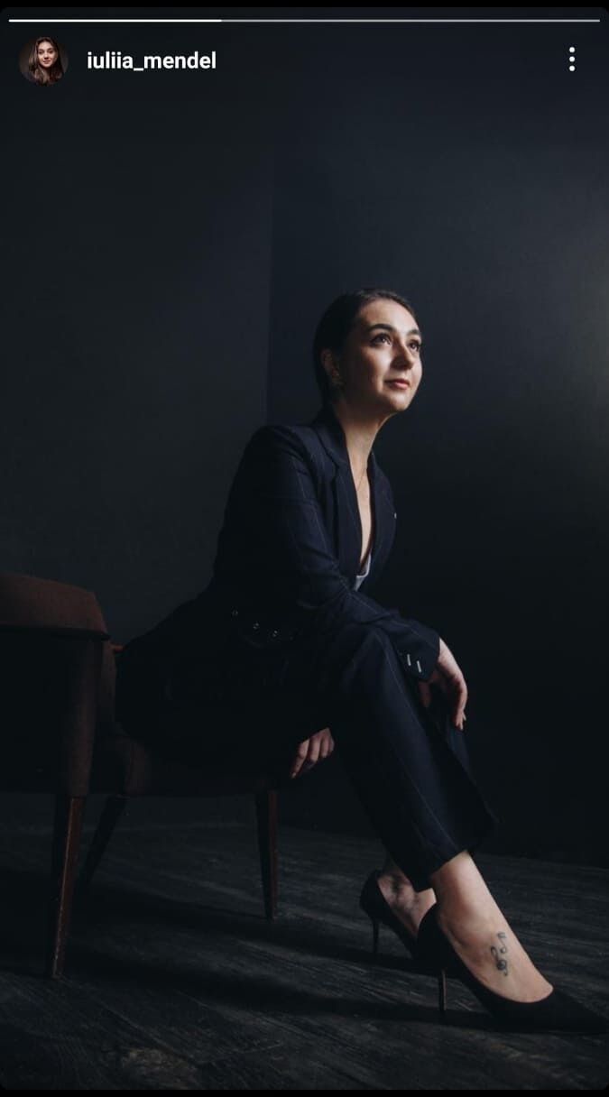 Прессекретарка українського президента Володимира Зеленського Юлія Мендель 2 січня в Instagram Stories розмістила фото, на якому було зображено, як вона сидить на краю стільця в темному брючному костюмі.