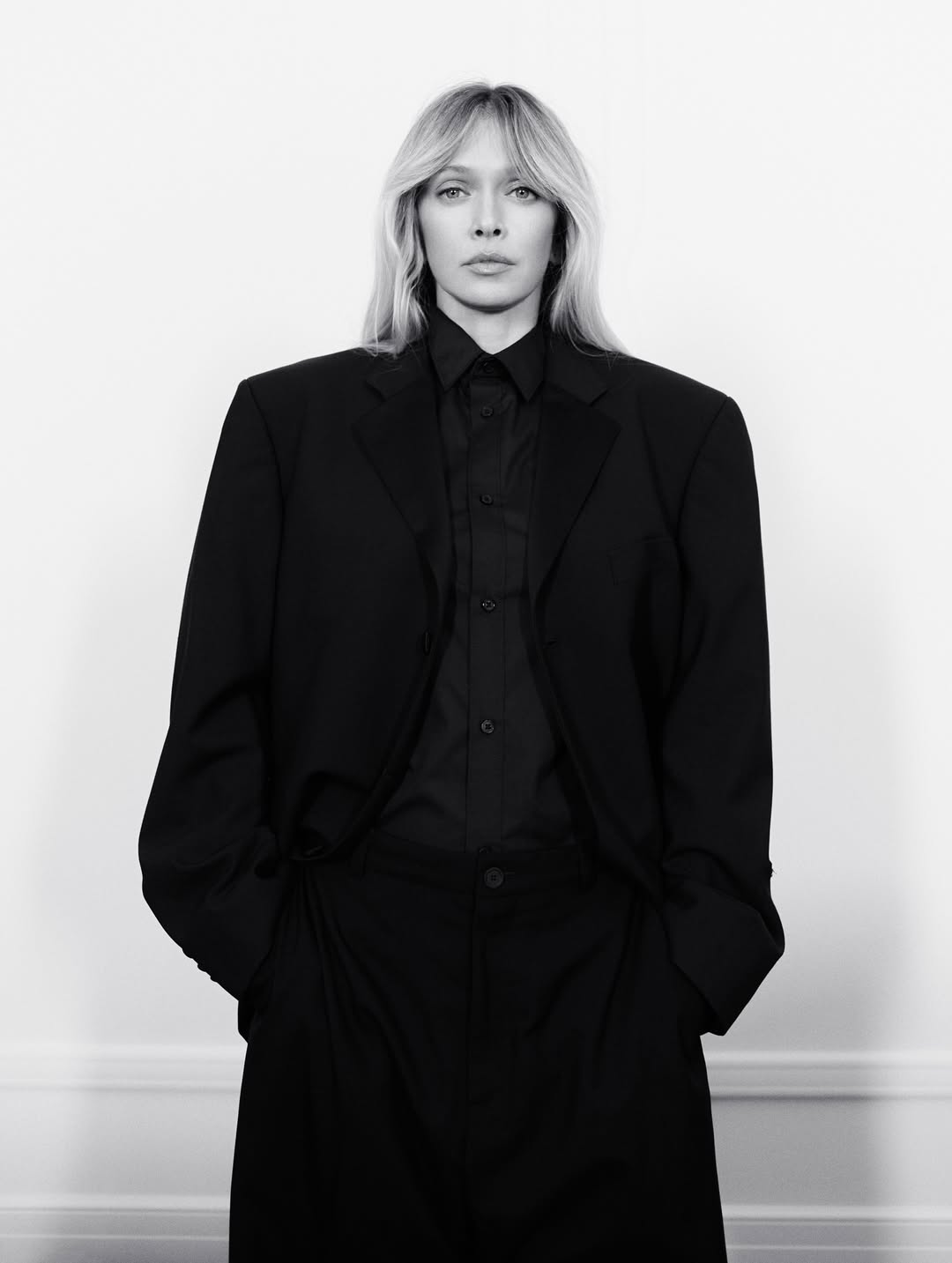 Співачка позувала в чорному костюмі в чоловічому стилі й суворій чорній сорочці.