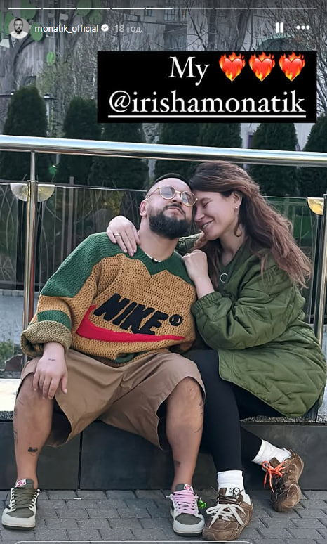 Український співак Monatik (Дмитро Монатік) 18 квітня розмістив в Instagram Stories фото, на якому його зафіксовано в обіймах із дружиною Іриною.