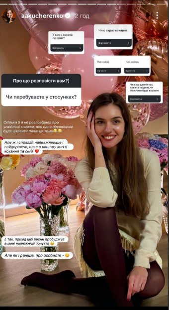 "Скільки б я не розповідала про улюблені книжки, все одно підписників буде цікавити лише ця тема. Але ж і справді – найважливіше, що є в нашому житті, – кохання і сім'я, – написала вона. – І так, прихід цієї весни пробуджує в мені найніжніші почуття".