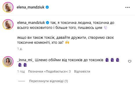 "Так, я токсична людина, токсична до всього московитого, й більше того, пишаюся цим. Якщо ви також токсик, давайте дружити, створимо своє токсичне ком'юніті. Хто за?" – написала вона.