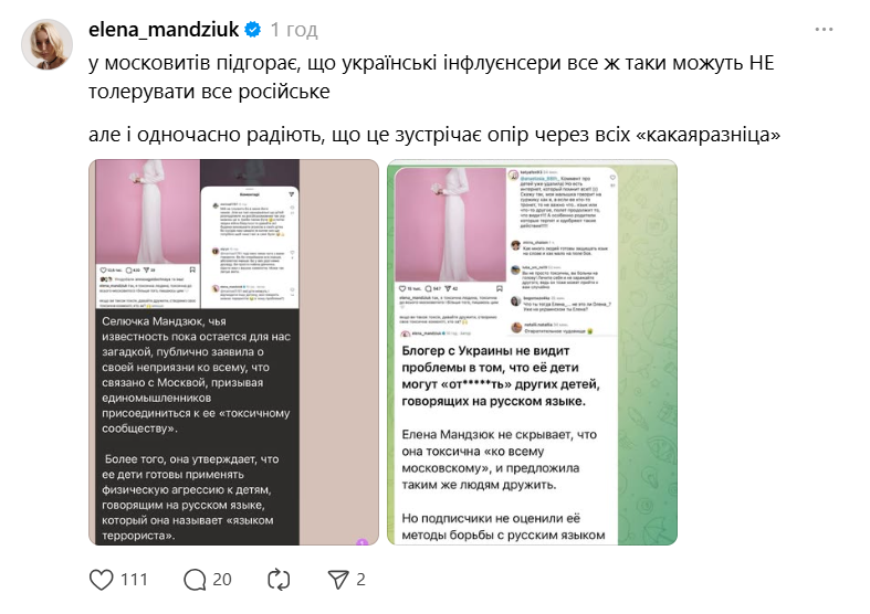 На початку травня 2025 року Мандзюк розкритикувала українську блогерку Анну Алхім, яка веде свій блог російською мовою.