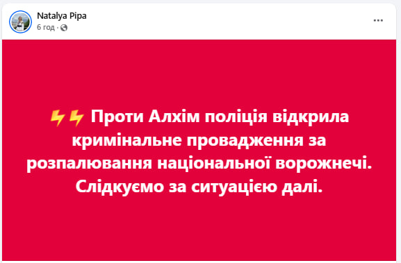 "Проти Алхім поліція відкрила кримінальне провадження за розпалювання національної ворожнечі. Слідкуємо за ситуацією далі", – написала нардепка.