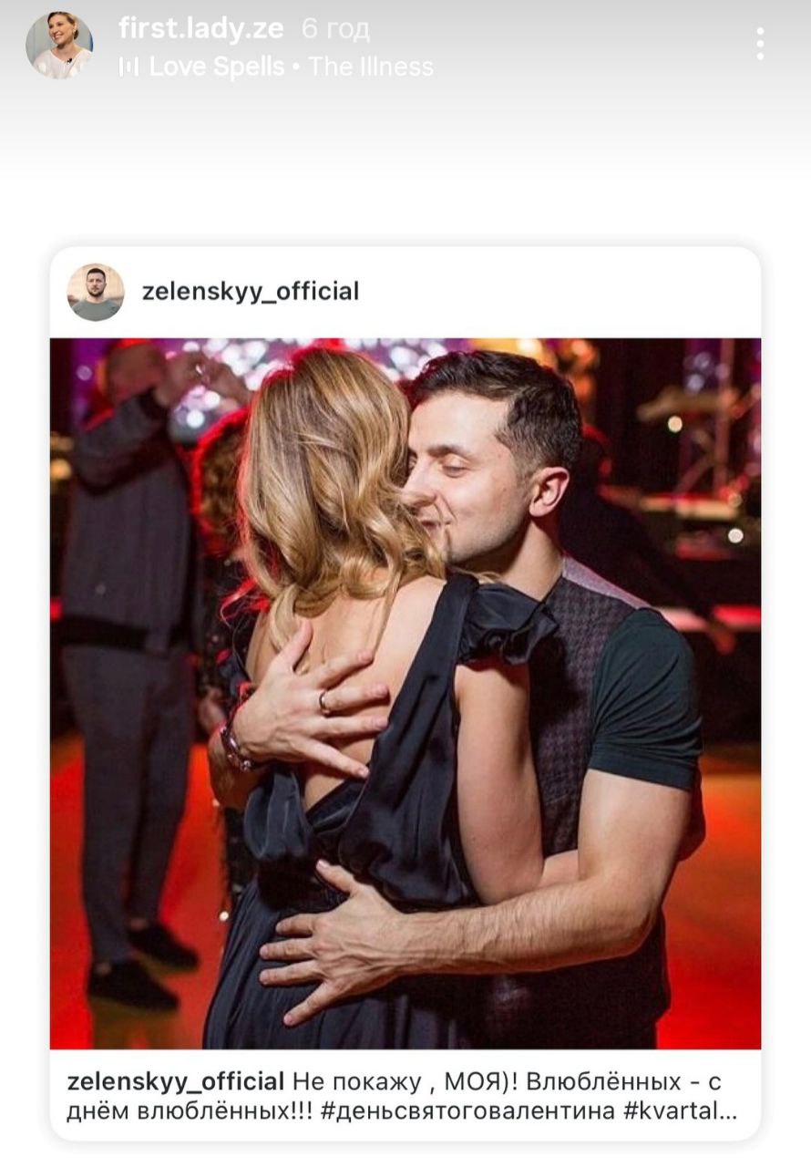 Фан-акаунт першої леді України Олени Зеленської в День святого Валентина, 14 лютого, на своїй сторінці в Instagram Stories розмістив архівне фото, на якому її зафіксовано в обіймах чоловіка, українського президента Володимира Зеленського.