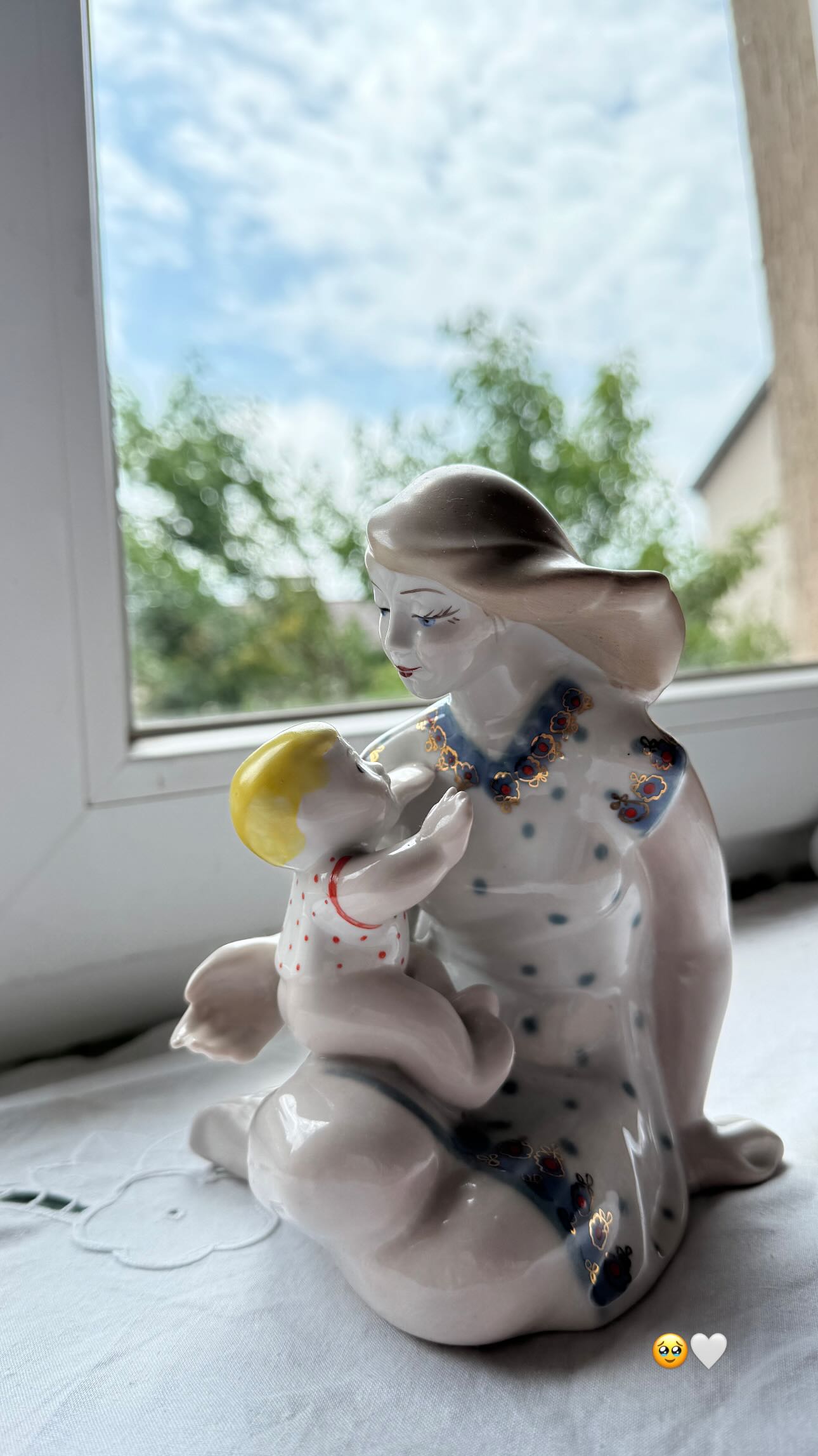 На фото телеведуча показала підвіконня зі статуеткою. Це порцелянова фігурка жінки в сукні в горох, яка тримає на руках дитину. Можна помітити, що підвіконня вкрите серветкою, оздобленою в техніці рішельє.