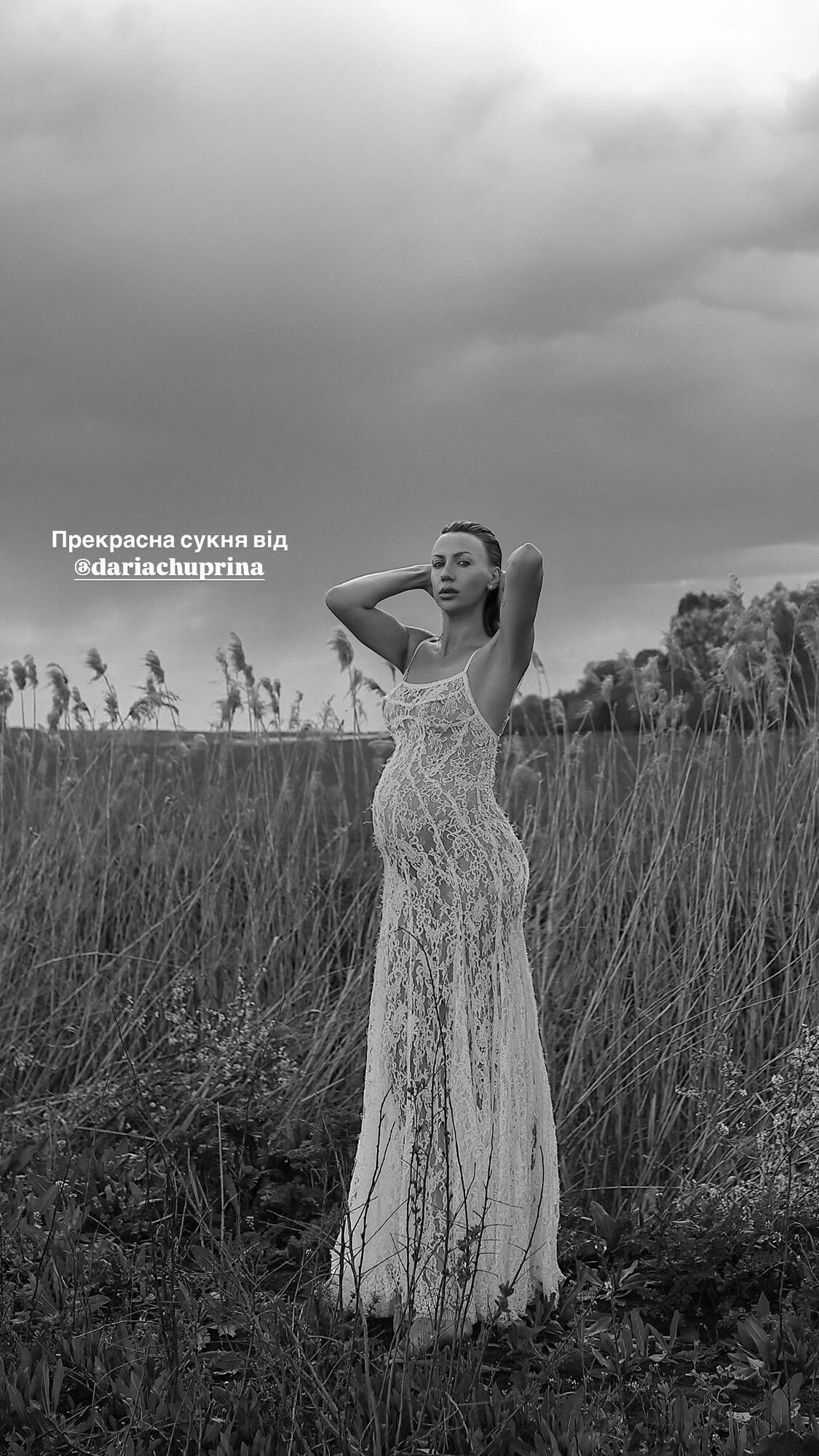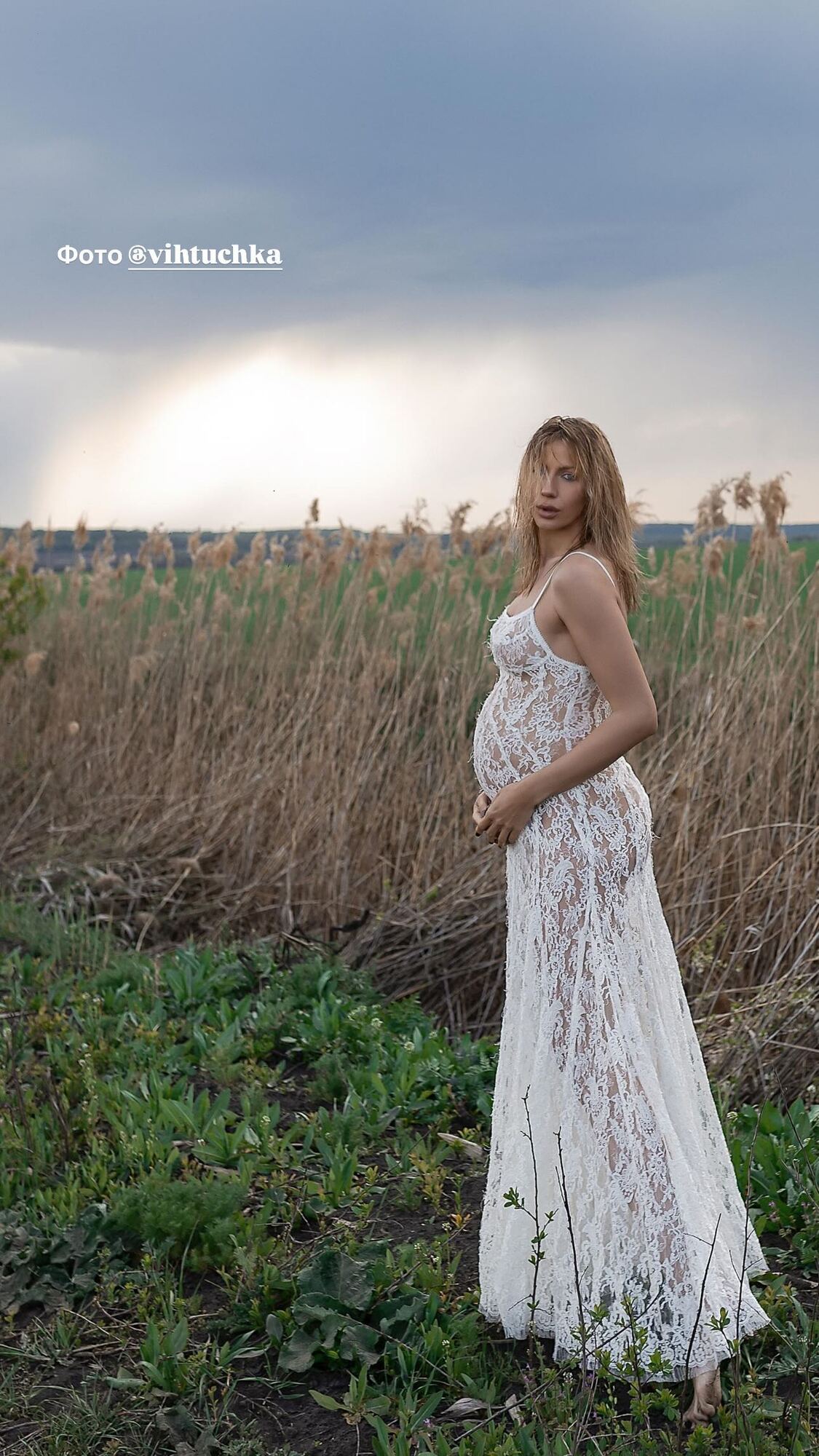 Нікітюк, яка зараз на дев'ятому місяці вагітності, повідомила, що для фотосесії обрала білу мереживну сукню від української дизайнерки Дар'ї Чуприни.