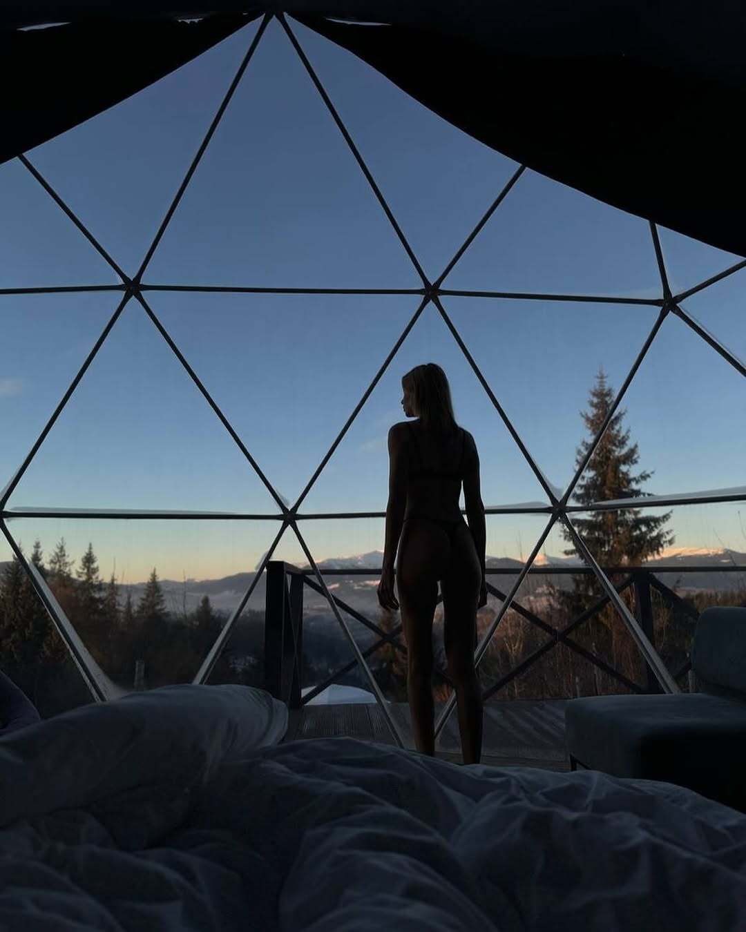 Телеведуча знялася біля панорамного вікна на тлі гір. Вона позувала стоячи, одягнена у спідню білизну: бюстгальтер і стринги. Вона постала біля розстеленого ліжка з білим простирадлом.
