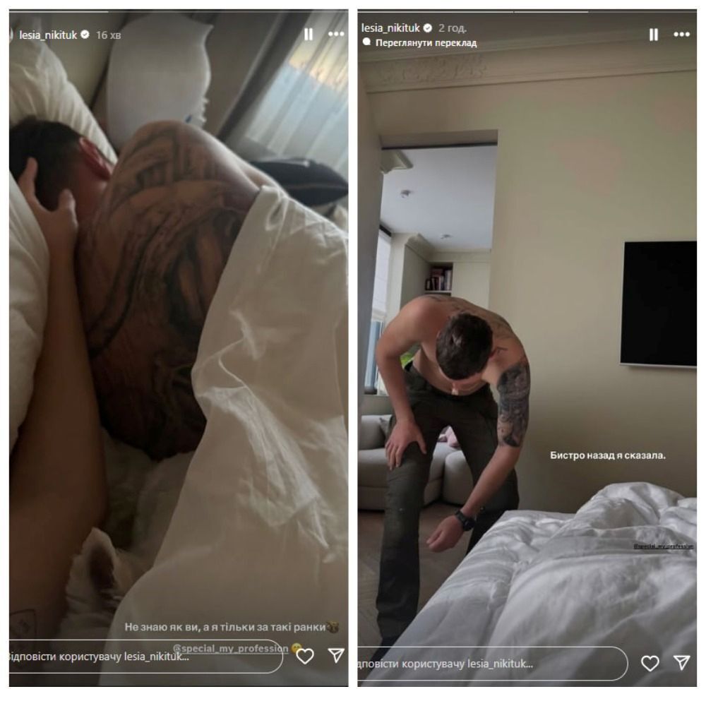 Українська ведуча Леся Нікітюк провела ніч зі своїм нареченим, українським військовослужбовцем Дмитром Бабчуком. Про це вона повідомила 3 червня, розмістивши відповідні фото в Instagram Stories.