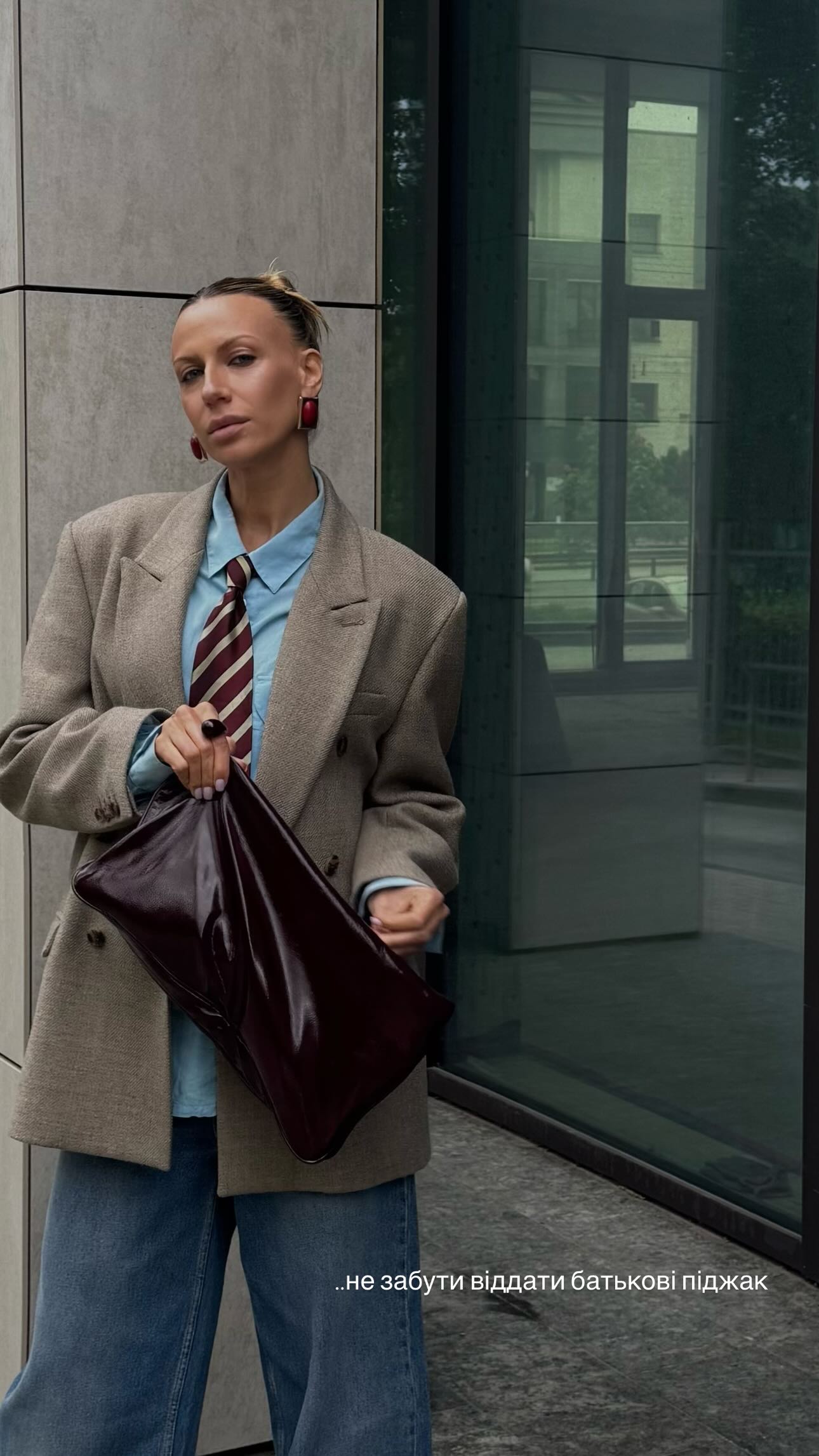 Нікітюк позувала у джинсах, сіро-бежевому піджаку, блакитній сорочці й смугастій краватці кольору бордо. Образ вона доповнила бордовим лакованим клатчем.
