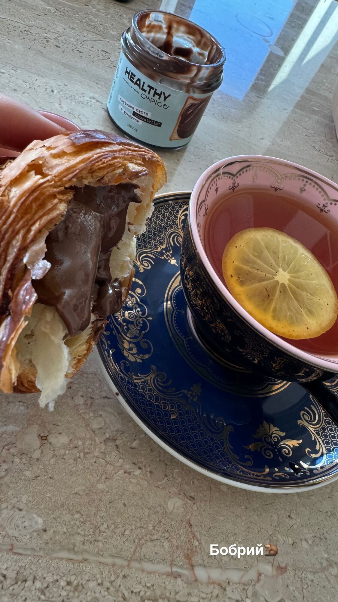 Нікітюк сфотографувала стіл, на якому стоїть кобальтова з позолотою чашка із блюдцем, наповнена чаєм із лимоном. У руці вона тримала круасан із шоколадною пастою.