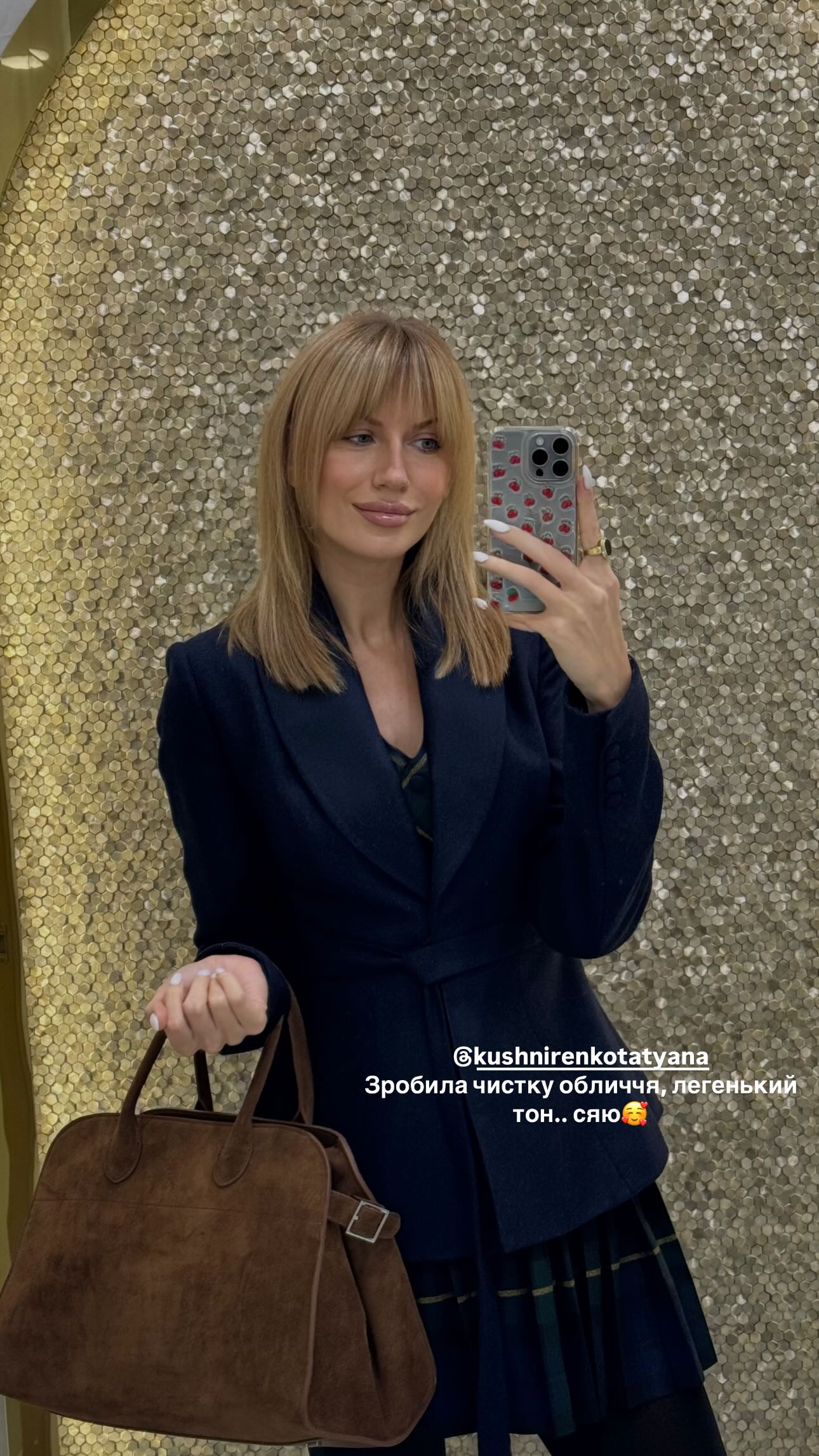 Телеведуча знялася в подовженому темно-синьому жакеті й картатій спідниці зеленого кольору. У руці вона тримала коричневу замшеву сумку.