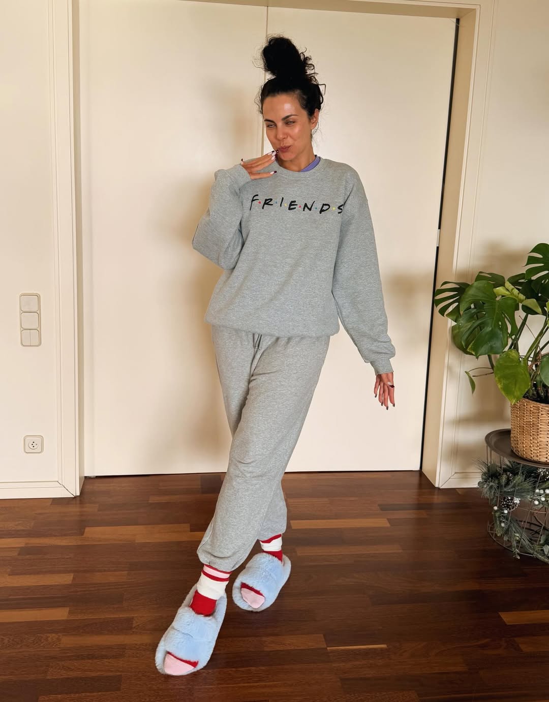 На другому фото Каменських у сірому спортивному костюмі й капцях. Співачка повторила позу з попереднього знімка. Вона позувала, прикривши очі.