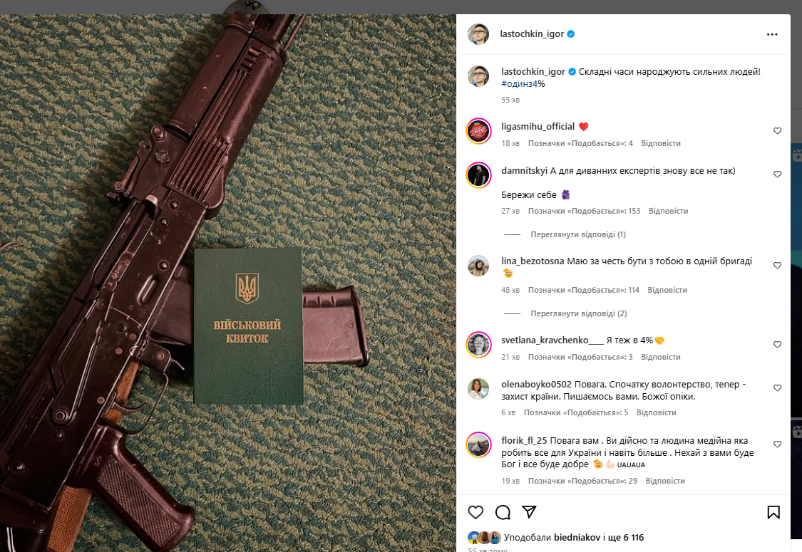 Актор студії "Квартал 95" Ігор Ласточкін приєднався до Збройних сил України. Про це він повідомив 19 лютого в Instagram.