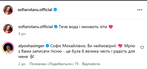 "Софіє Михайлівно, ви неймовірні. Мрію з вами записати пісню – це була б велика честь і радість для мене", – написала артистка.
