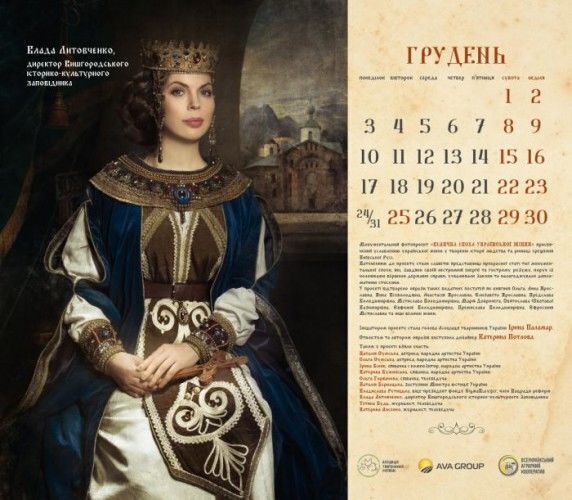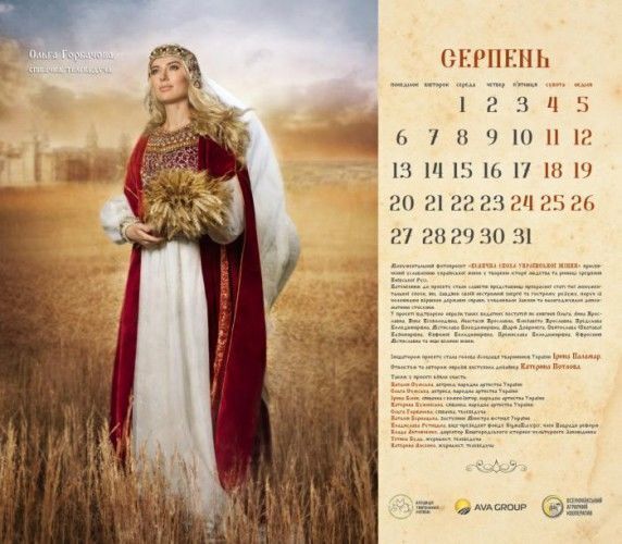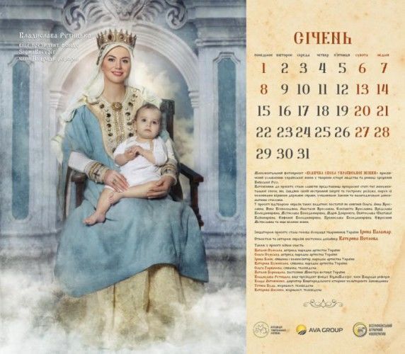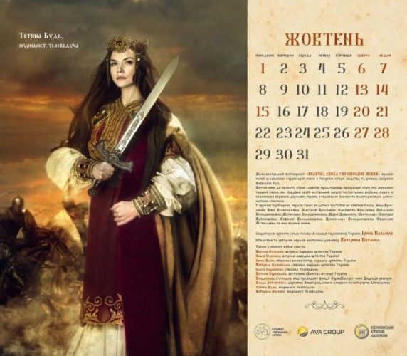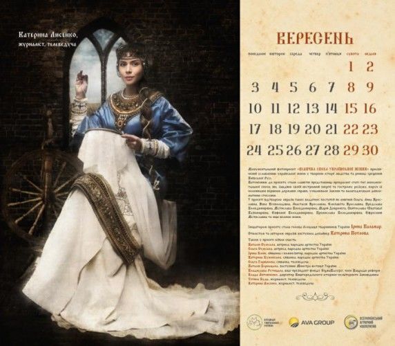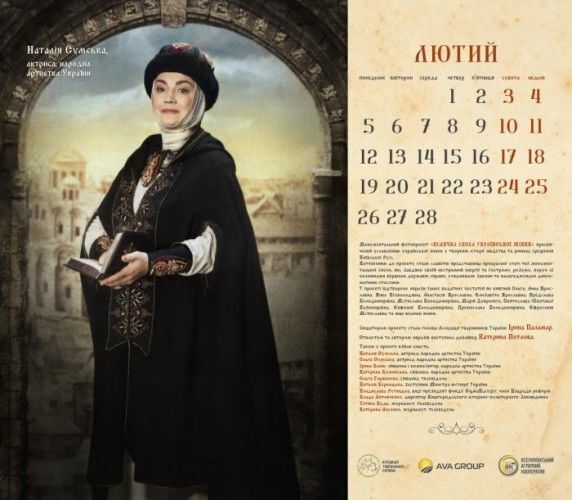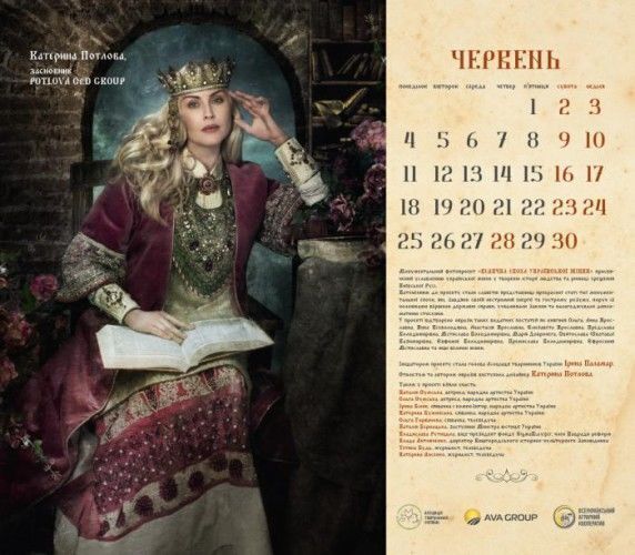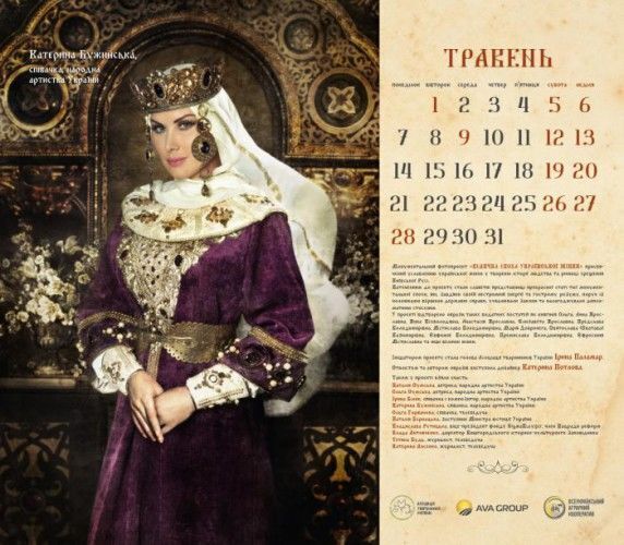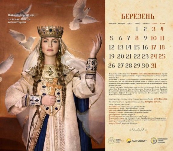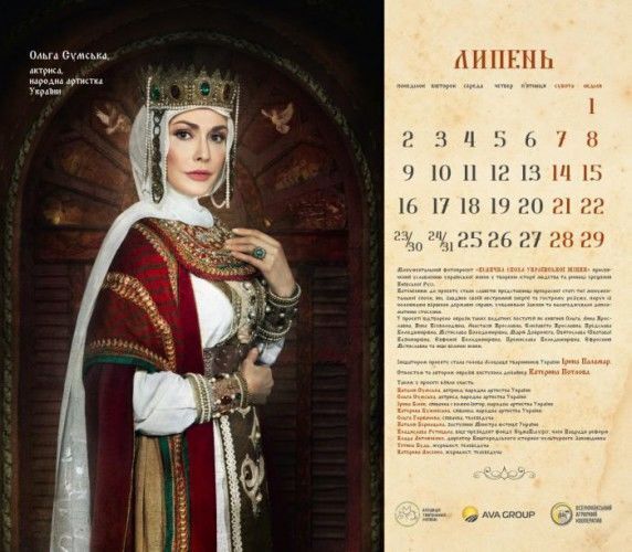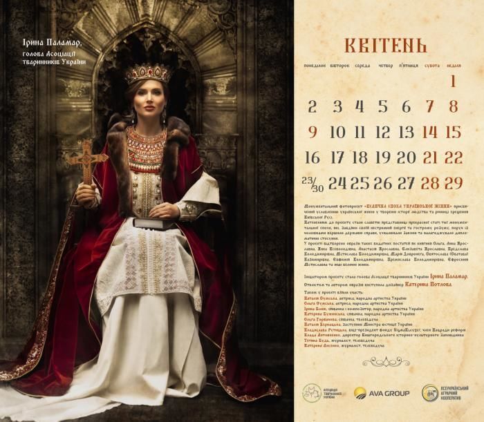 Актриси Наталія й Ольга Сумські, співачки Ірина Білик, Ольга Горбачова, Катерина Бужинська, заступник міністра юстиції України Наталія Бернацька, віце-президент фонду Sigma Bleyzer, член Нацради реформ Владислава Рутицька, директор Вишгородського історико-культурного заповідника Влада Литовченко, журналістки Тетяна Будь і Катерина Лисенко знялися для календаря "Велична доба української жінки". Фото оприлюднили на сайті Асоціації тваринників України, голові якої, Ірині Паламар, належить ідея проекту. Героїні постали в образах княгинь Київської Русі. Автором образів стала дизайнер Катерина Потлова.