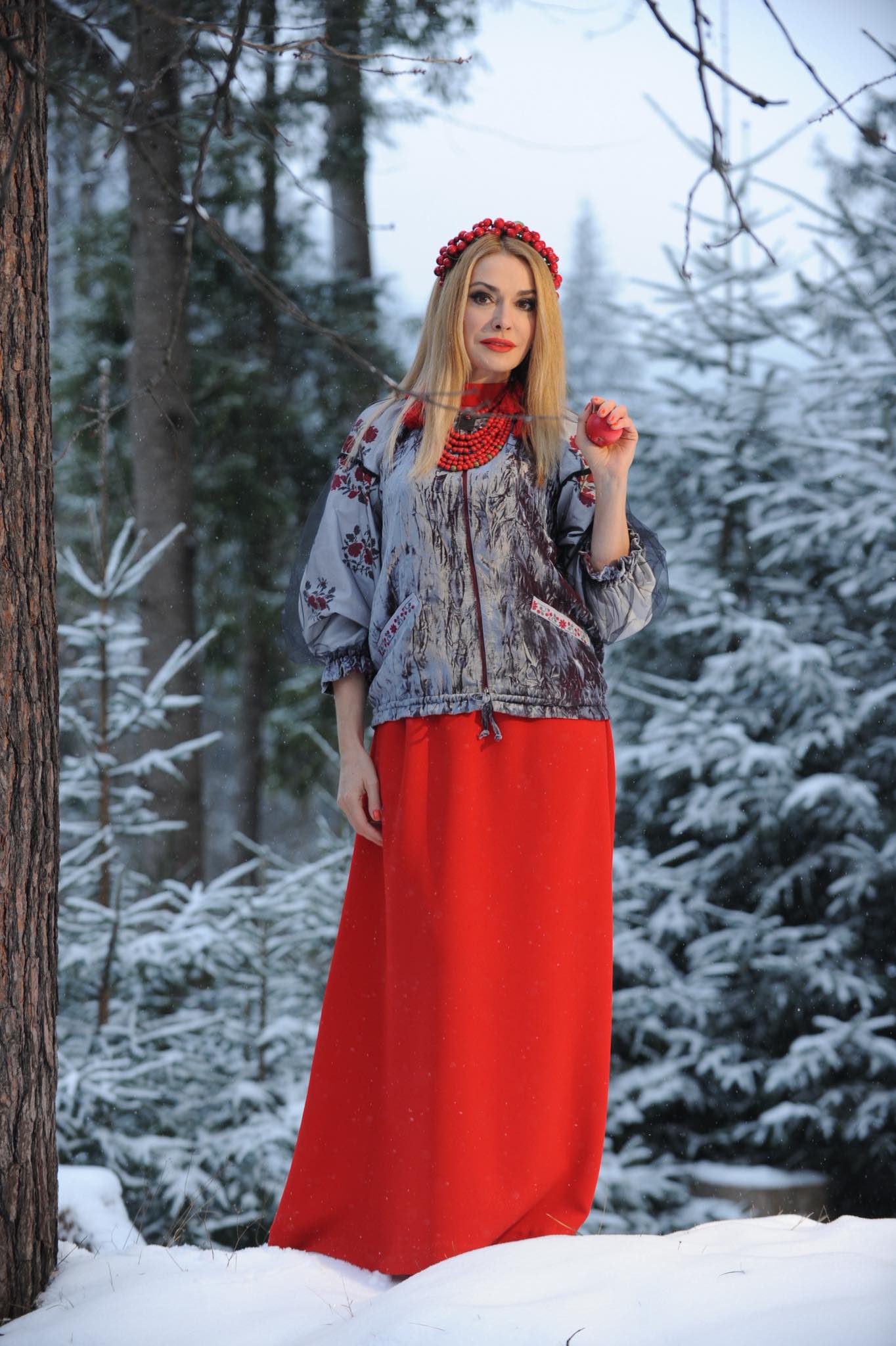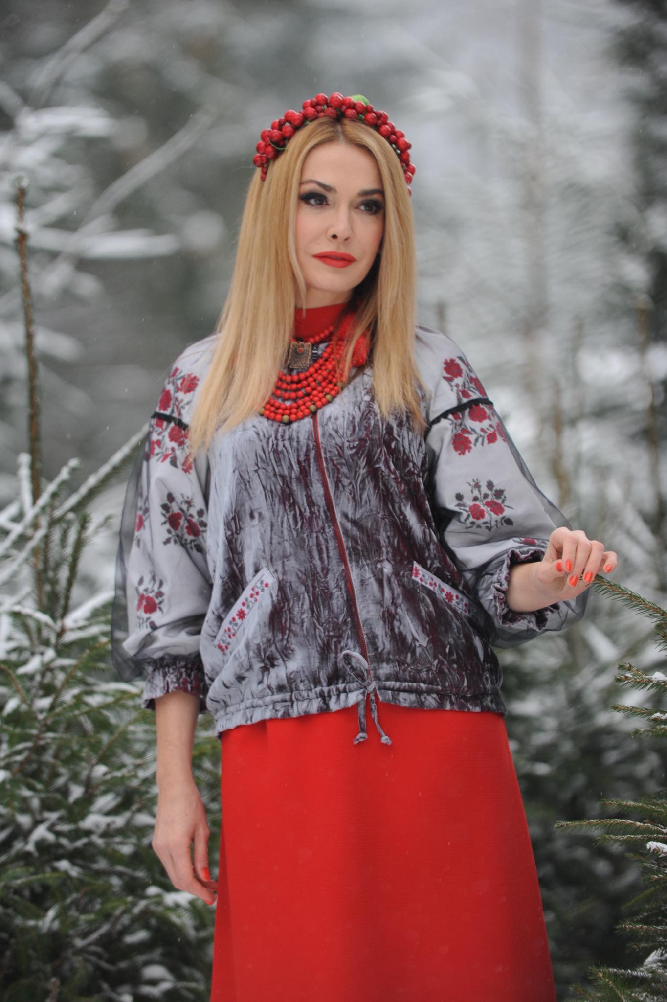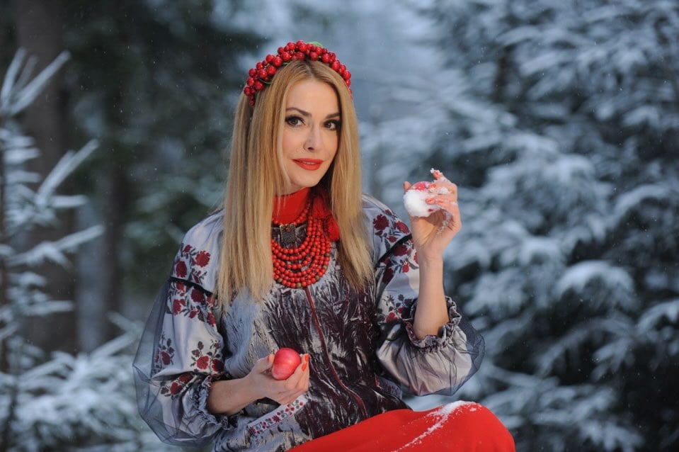 Актриса зазначила, що в епоху ШІ старі світлини їй нагадують, що "людину він не переможе, так як і майстерність справжніх творців". На фото вона позує на тлі засніжених краєвидів у червоній сукні, намистах і стилізованій під вишивану сорочку куртці.
