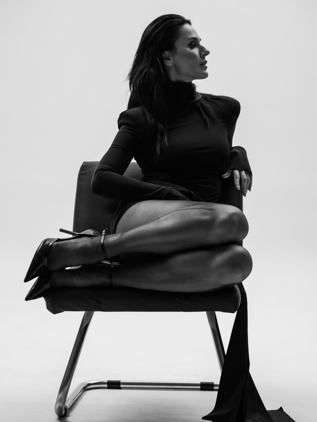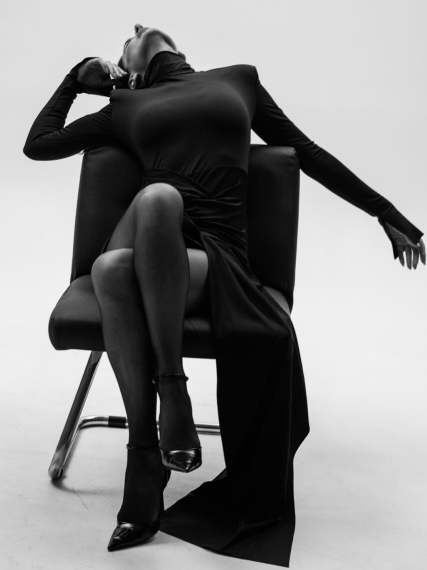 До поста вона додала ефектні чорно-білі знімки у сукні з розрізом, яка облягає тіло, і туфлях на підборах. Телеведуча знялася в офісному кріслі.