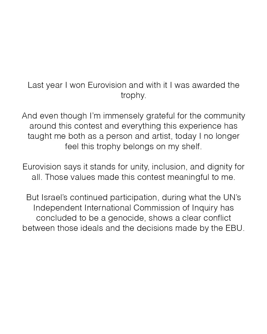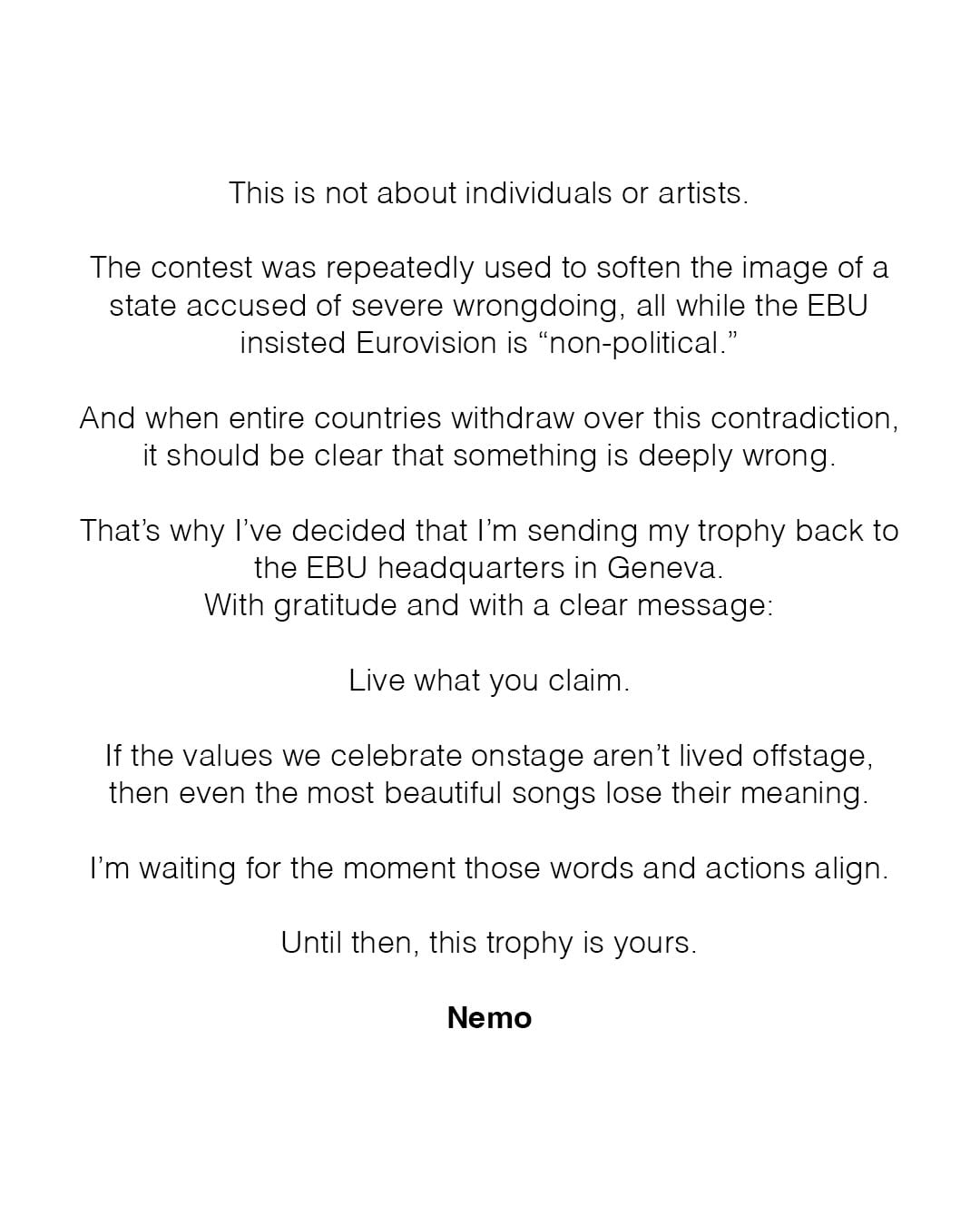 "І коли цілі країни відмовляються від участі через цю суперечність, має бути зрозуміло, що щось не так. Ось чому я вирішив відправити свій трофей назад до штаб-квартири ЕВU в Женеві, – повідомили Nemo. – Якщо цінності, які ми прославляємо на сцені, не втілюються в життя за лаштунками, то навіть найпрекрасніші пісні втрачають свій сенс".