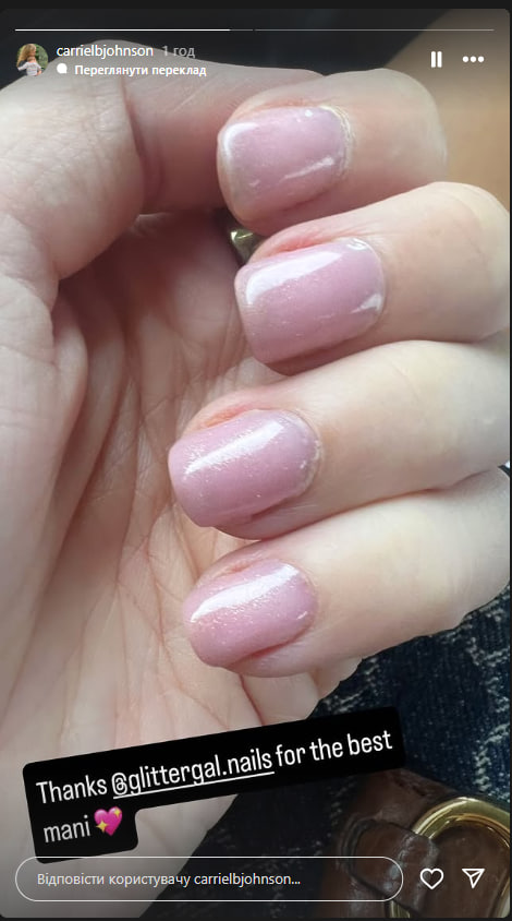 Вона подякувала майстру за "найкращий манікюр". Дружина Джонсона віддала перевагу ніжно-рожевому покриттю з блискітками на нігтях середньої довжини.
