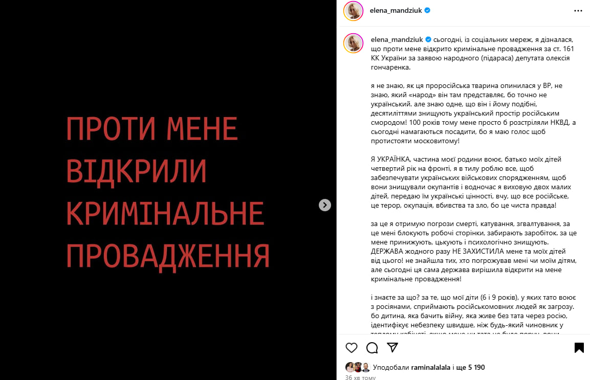 "Держава жодного разу не захистила мене та моїх дітей від цього, але сьогодні ця сама держава вирішила відкрити на мене кримінальне провадження! І знаєте за що? За те, що мої діти сприймають російськомовних людей як загрозу, – обурилася блогерка. – То скажіть, кого тут утискають? Чому в тилу українців цькують за ненависть до всього російського? Чому держава закриває очі на проросійську нечисть?"