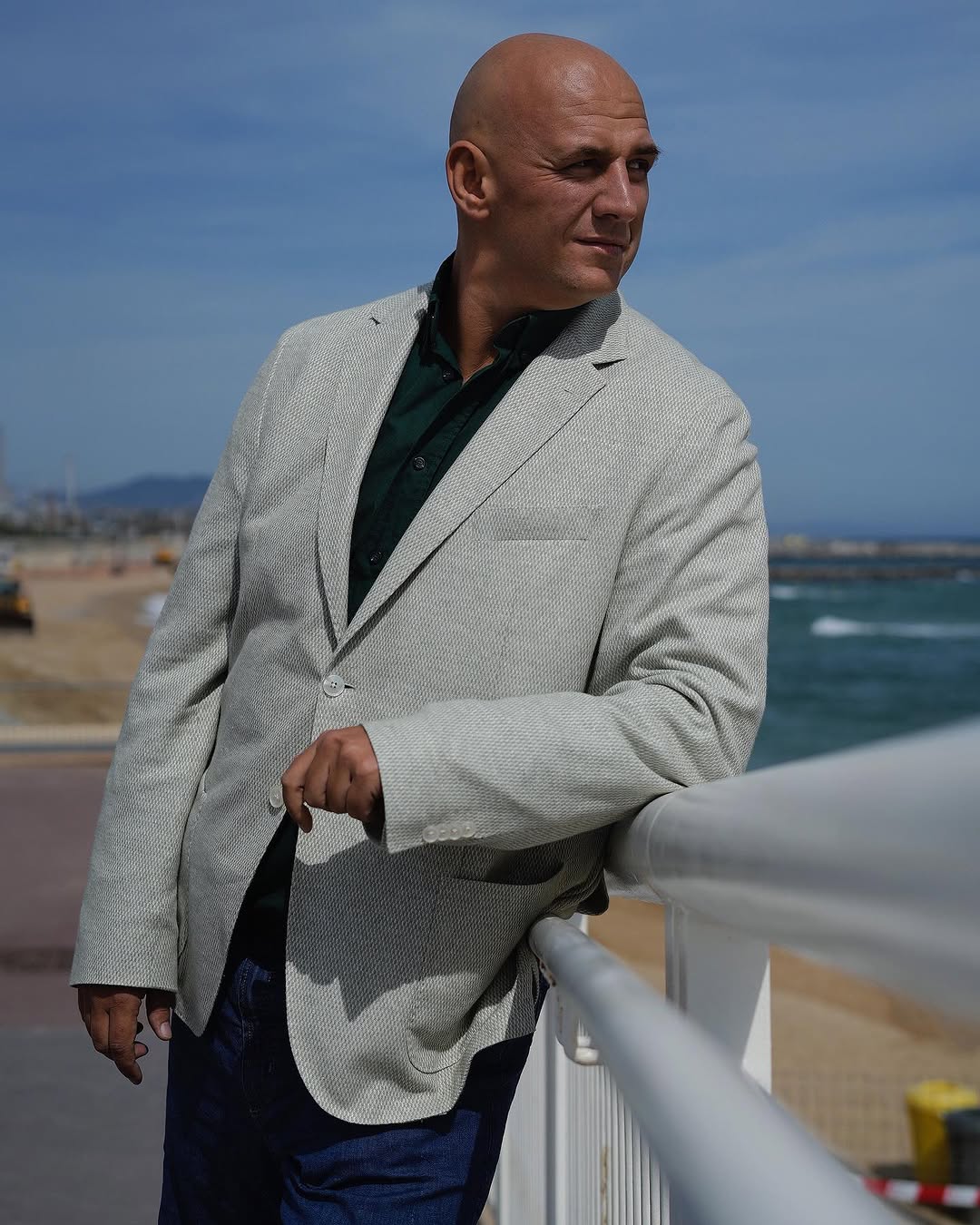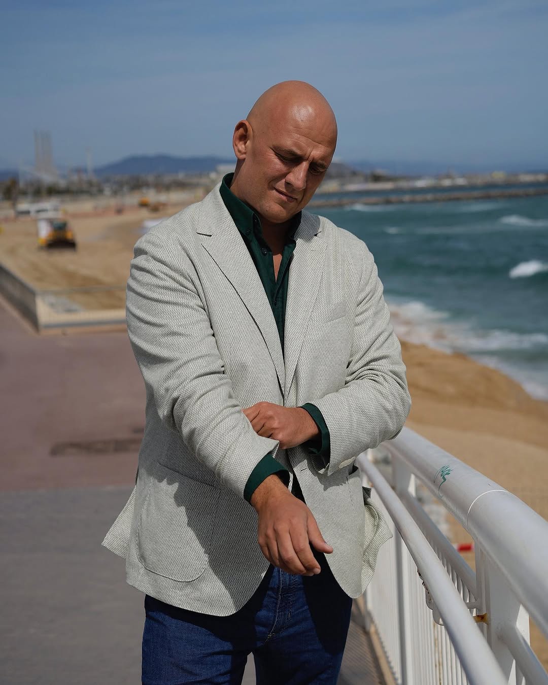 Потап позував на тлі океанічної затоки. Його знято у світло-сірому піджаку, темно-зеленій сорочці й темно-синіх джинсах.
