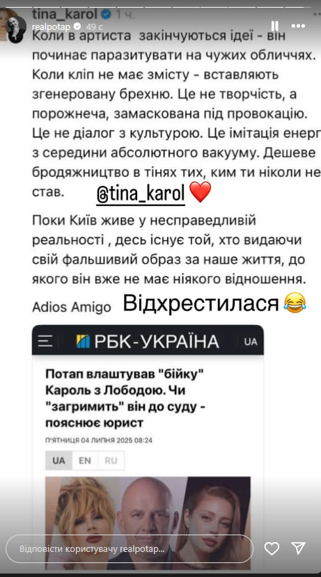 Український шоумен Потап (Олексій Потапенко) 4 липня в Instagram Stories відповів своїй колезі Тіні Кароль, яка публічно розкритикуала його новий кліп.