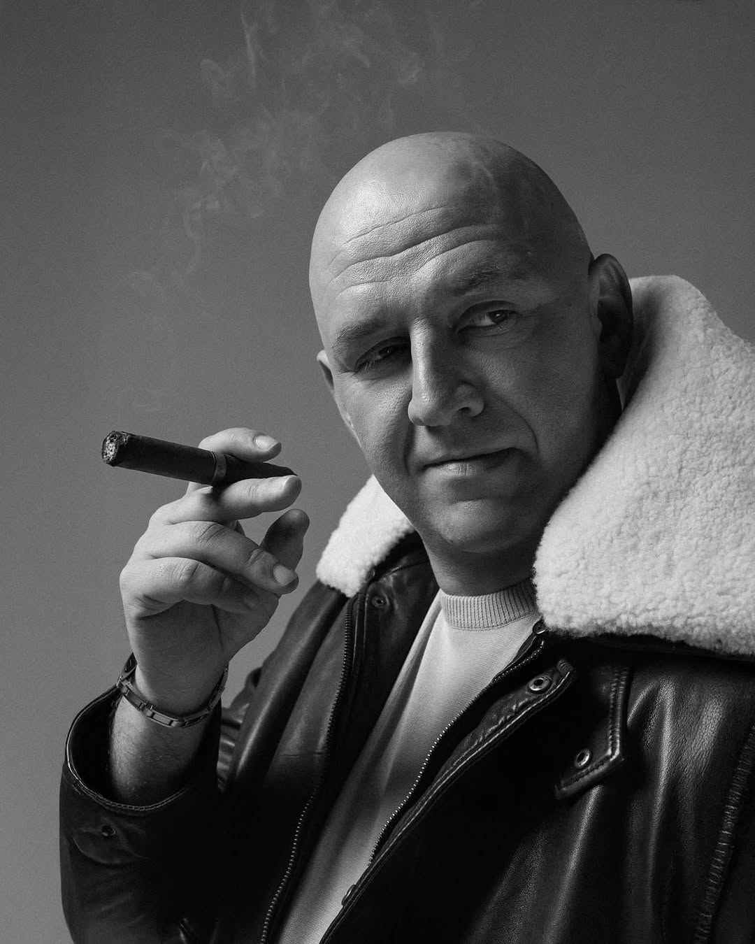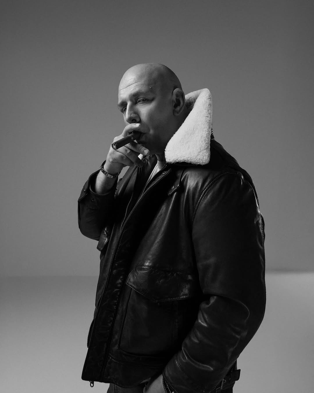 Шоумен позував у шкіряній куртці з хутряним коміром. У руці він тримав сигару. А на другому фото показав безпосередньо, як курить.
