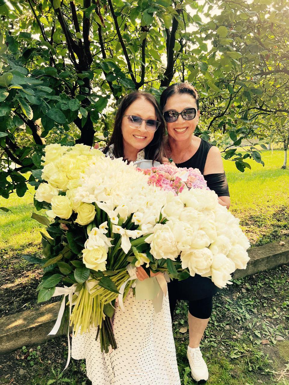 На фото співачка позує, обіймаючись із сестрою й тримаючи в руках букети.