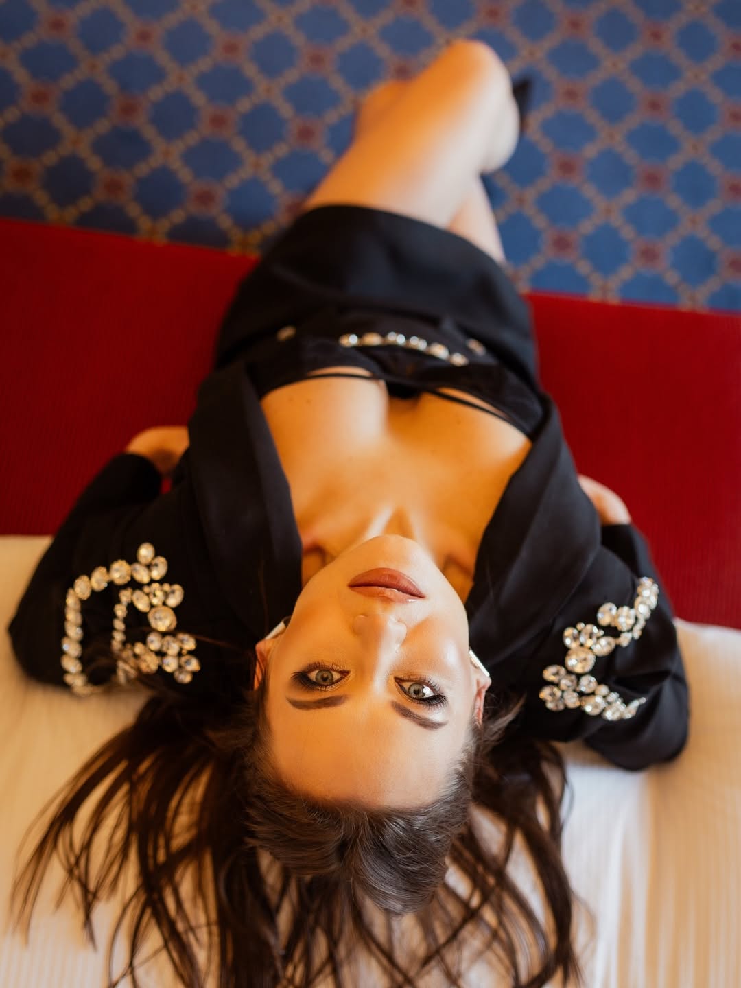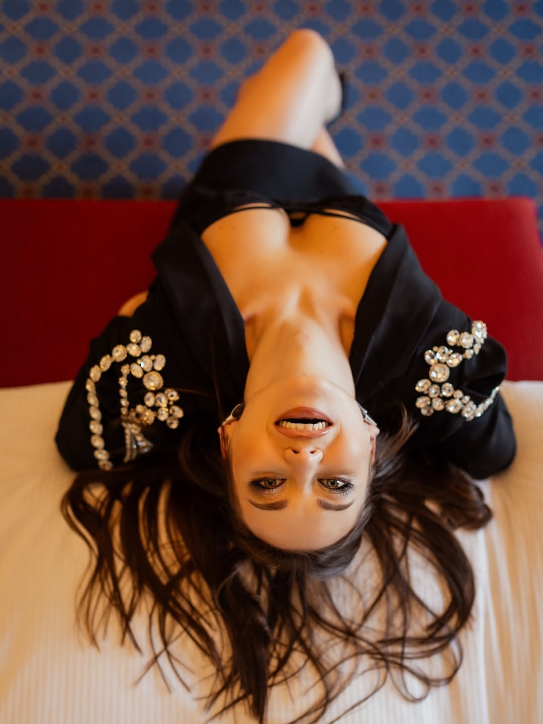 Фото було зроблено в готелі. Саліванчук позувала в мініспідниці й жакеті. Вона засвітила бюст із верхнього ракурсу.